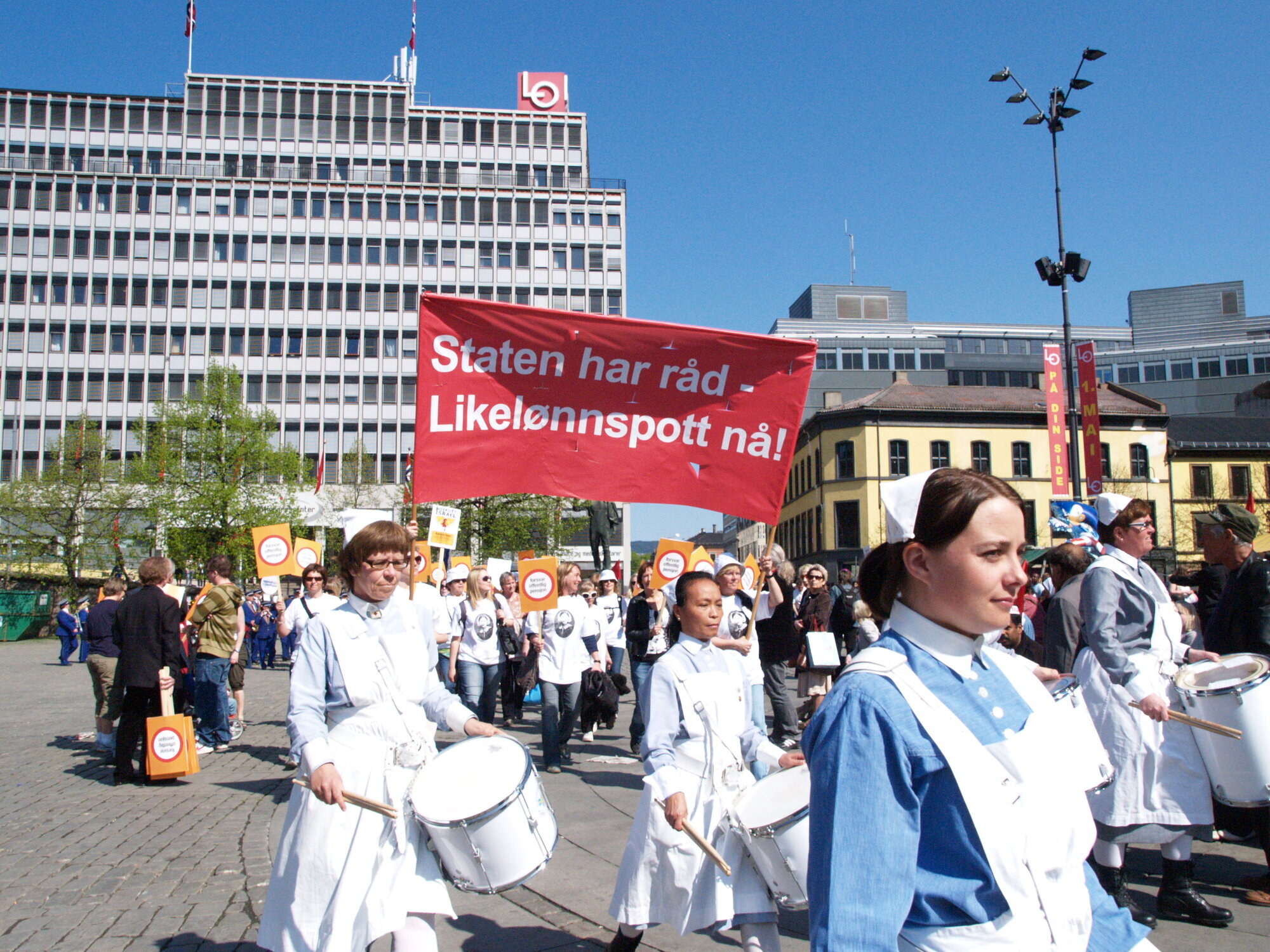 Kristin Halvorsen trakk frem likelønn som en viktig oppgave fra talerstolen på Youngstorget. Statsminister Jens Stoltenberg var taus om likelønn, men trakk frem nye tiltak for å få bukt med sosial dumping.