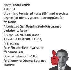 Hun heter Diane Beetham og er leder for de 130 sykepleierne som jobber i fengselet. 94 prosent av dem har fulle stillinger. Lønningene er økt med 30 prosent etter at den nye administrasjonen kom og mange nye helsepersonellstillinger er opprettet. Men guvernør Schwartzenegger har nå bestemt at alle statsansatte skal ha permisjon tre dager i måneden, for å kutte ned på lønningsutgiftene. Det motsatte har skjedd enkelte steder: Unge, uetablerte sykepleiere jobber ekstra mye overtid og får ekstra god lønn. På San Quentin utgjør permisjonstvangen minus 15 prosent i lønna.