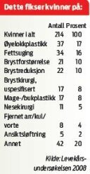 Statistisk sentralbyrå (SSB) har kommet frem til at 5 prosent av oss en eller flere ganger har lagt oss under kniven for skjønnhetens skyld. Det er over dobbelt så mange kvinner enn menn som får utført en kosmetisk operasjon: 7 prosent av kvinnene og 3 prosent av mennene. Rundt 10 prosent av dem som har gjort kirurgisk inngrep, har gjort det mer enn en gang.