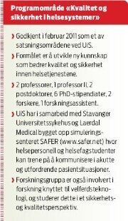 ![]() Et økende behov for mer forskning innen pasientsikkerhet, gjorde at miljøet innen samfunnssikkerhet ved UiS kunne bruke sin kunnskap om sikkerhet innen blant annet luftfart og petroleumsvirksomheten inn mot et helsevesen i endring. Gradvis har gruppen forskere under Aases ledelse vokst. De er i dag involvert i tre store nasjonale og internasjonale forskningsprosjekter innenfor feltet. I tillegg har de seks doktorgradsprosjekter.