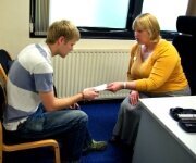 UTSLETT: Sykepleier Alison Perry skriver ut informasjon om ringorm til Steve Poulson.