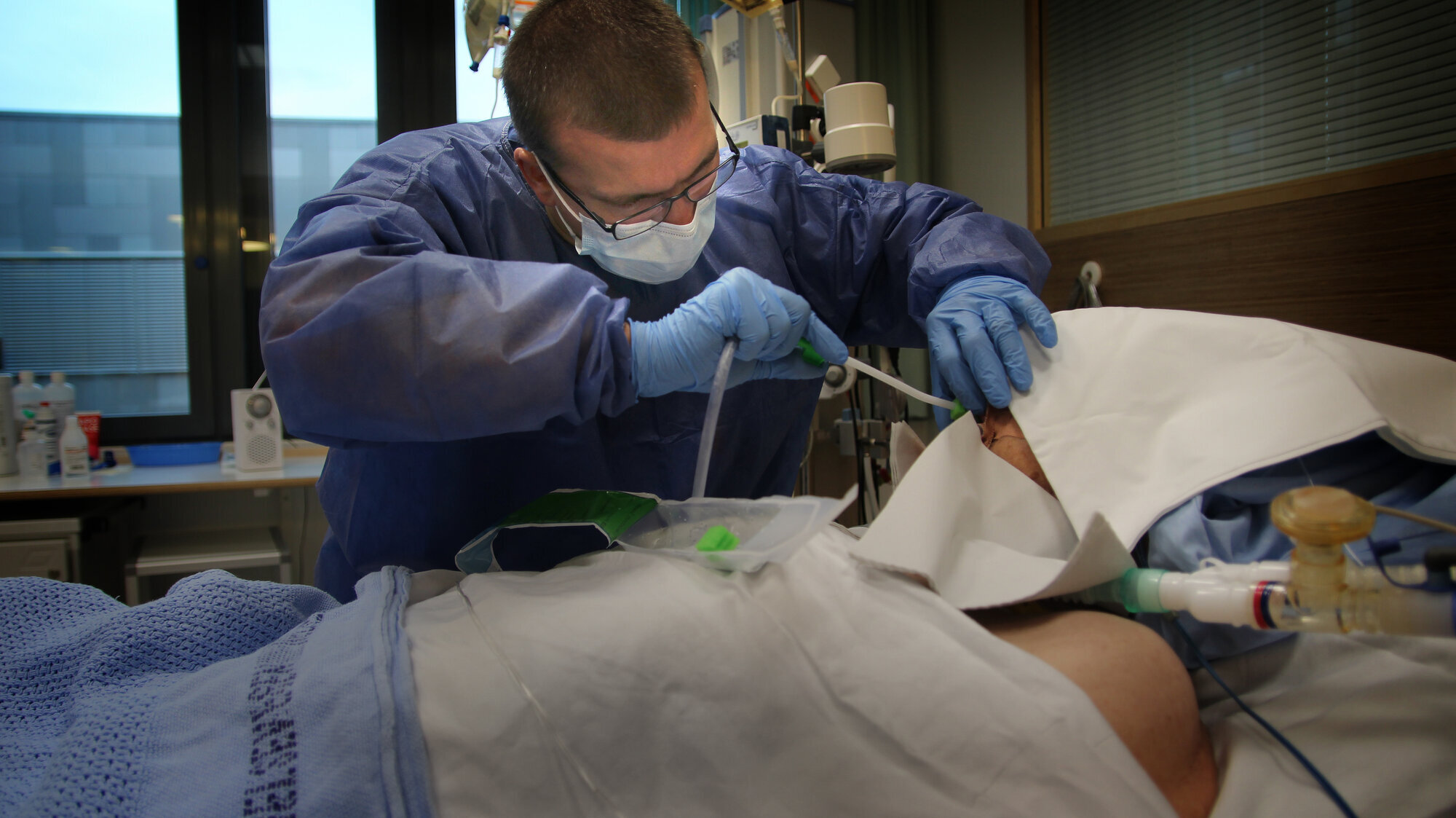 – Nå kommer jeg ned her, sier intensivsykepleier Ola Mikalsen til pasienten i senga, før han starter med trachial-suging for å fjerne slim.