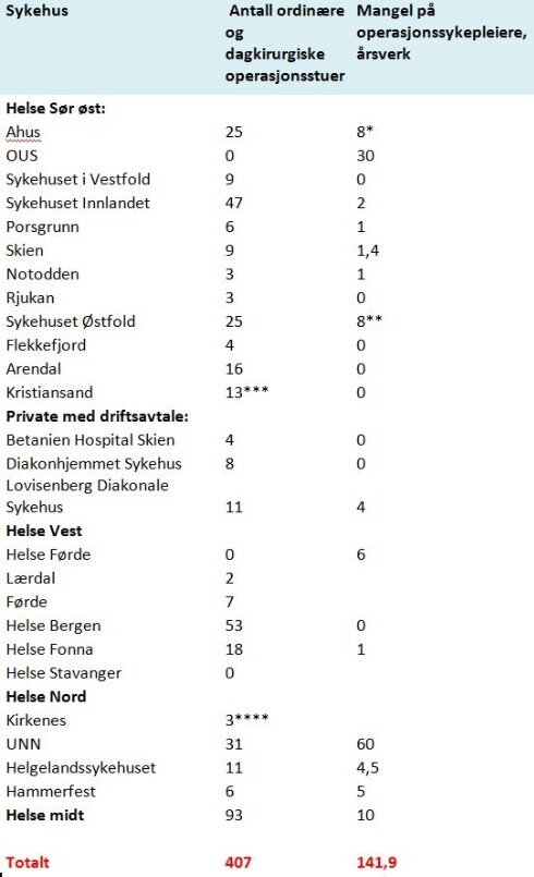 * Gjelder fra høsten ** Alle blir besatt fra juni *** Har for tiden stengt fire av 13 operasjonsstuer for renovering **** Har overskudd på operasjonssykepleiere