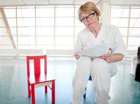 Foran henne ligger et sett utskrifter. Her er det blant annet beskrevet hva helsepersonell bør se opp for. Det kan være blåmerker som det ikke er naturlig at barn har fått gjennom vanlig lek. Snøremønstre på hals og nakke, rundt håndledd og ankler. Merker etter sigaretter. Alle fysiske tegn som kan tyde på at et barn blir mishandlet og som helsepersonell kan oppdage.