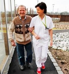 Sykepleier Randi Skartveit våger seg ut med bare armer sammen med pasient Arne Torbjørn Andersen. De spaserer raskt langs den asfalterte stien som snor seg gjennom en vinterblek sansehage, før de sier seg fornøyd. Andersen foretrekker å være innendørs og går videre til bingoen som holdes på dagavdelingen. Kanskje han vinner en pose chips.