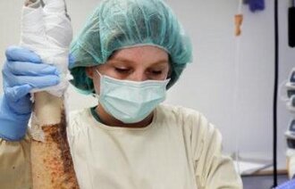 Hud skal flyttes fra lår og hode, det er den foreløpige planen. Den endelige avgjørelsen om hvor mye og hvor huden skal høstes fra, tas ikke før kirurgen kommer og tar ny status. Kine Pedersen henter varmelampe for å være på den sikre siden.