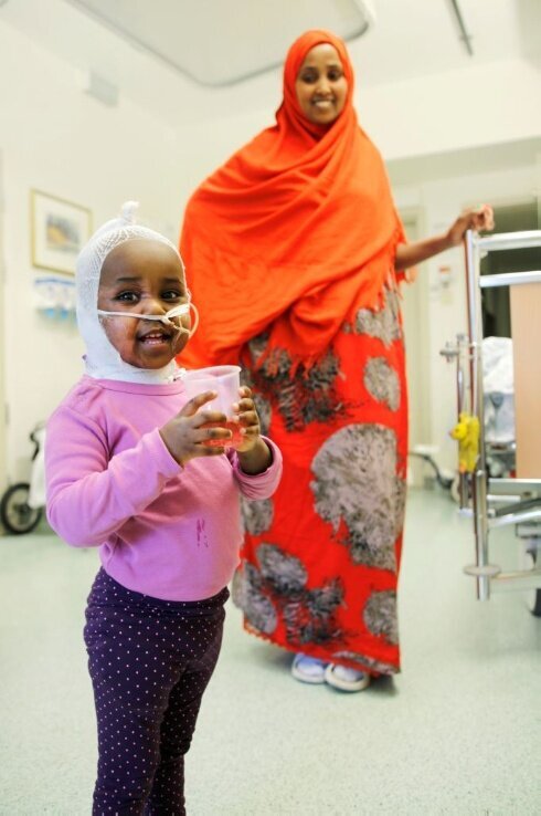 Det er fem uker siden Maida ble skrevet ut fra sykehuset. Mor forteller at hudtransplantasjonen ble infisert, så Maida måtte opereres en gang til, med hud fra låret. Da gikk det fint, og sårene er nå grodd til.