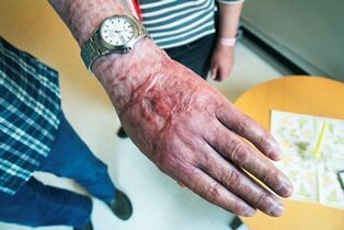 Lillian har vent seg til den nye huden hans, forteller hun, men ikke han. Han synes den er ruglete. Men noen fordeler har de mange hudtransplantasjonene ført til: Før hadde han psoriasis. Nå er den lidelsen vekke.