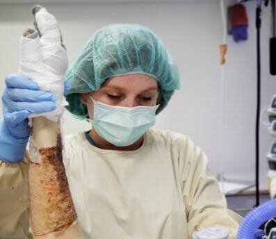 Intensivsykepleier Lillian Holme har jobbet ved avdelingen i tre år. Nå har hun fjernet de skitne bandasjene på armene til pasienten.
