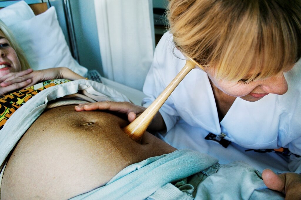Bildet viser en jordmor som lytter på en mage med jordmorstetoskop.