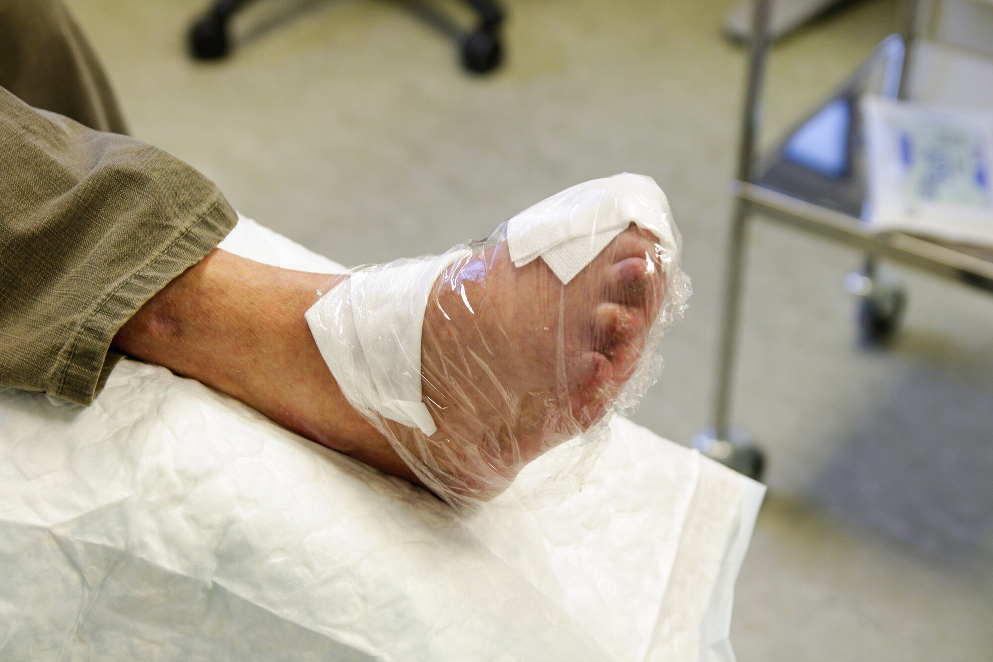Koordinator og sykepleier med spesialutdanning i sårstell, Rita Bügel­meyer, tar først av de gamle bandasjene. Så sprayer hun på bedøvelsesspray og pakker foten inn i plast for at sprayen skal få to minutter til å virke.