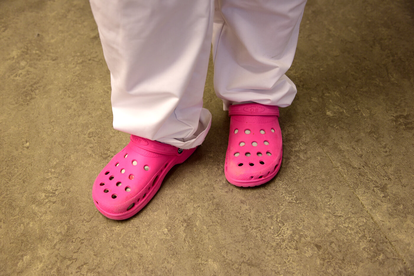 Midt i rommet lyser to rosa crocs opp blant sengebeina, og et par skritt unna står en student i hvite helsesandaler. Et par blå flip-flops ligger under senga ved vinduet. Lærerne går i hvite helsesko med hælkappe.