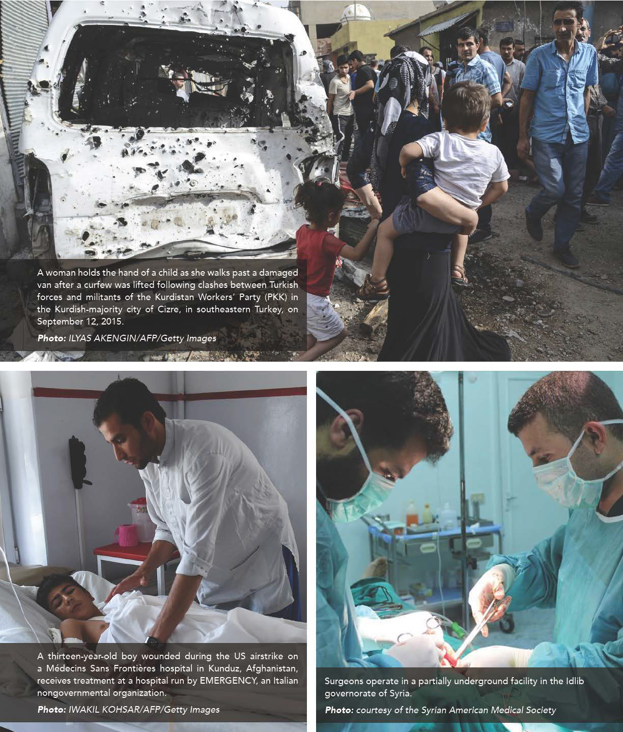 Genevekonvensjonene og internasjonal rett brytes hver eneste dag. Sykehus bombes, helsearbeidere blir angrepet, og tilgangen til helsetjenester, medisiner og forsyninger er under vedvarende angrep. I Syria ble ifølge rapporten 27 prosent av helsearbeiderne som ble drept i 2015 enten henrettet eller torturert til døde.