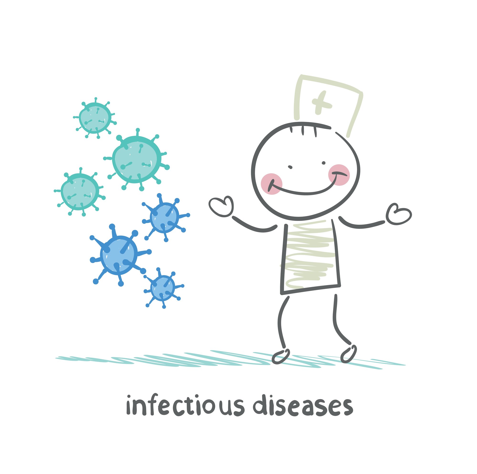 Illustrasjonen viser et strekmenneske i sykepleierdrakt som holder hendene ut og rundt danser mikrober.