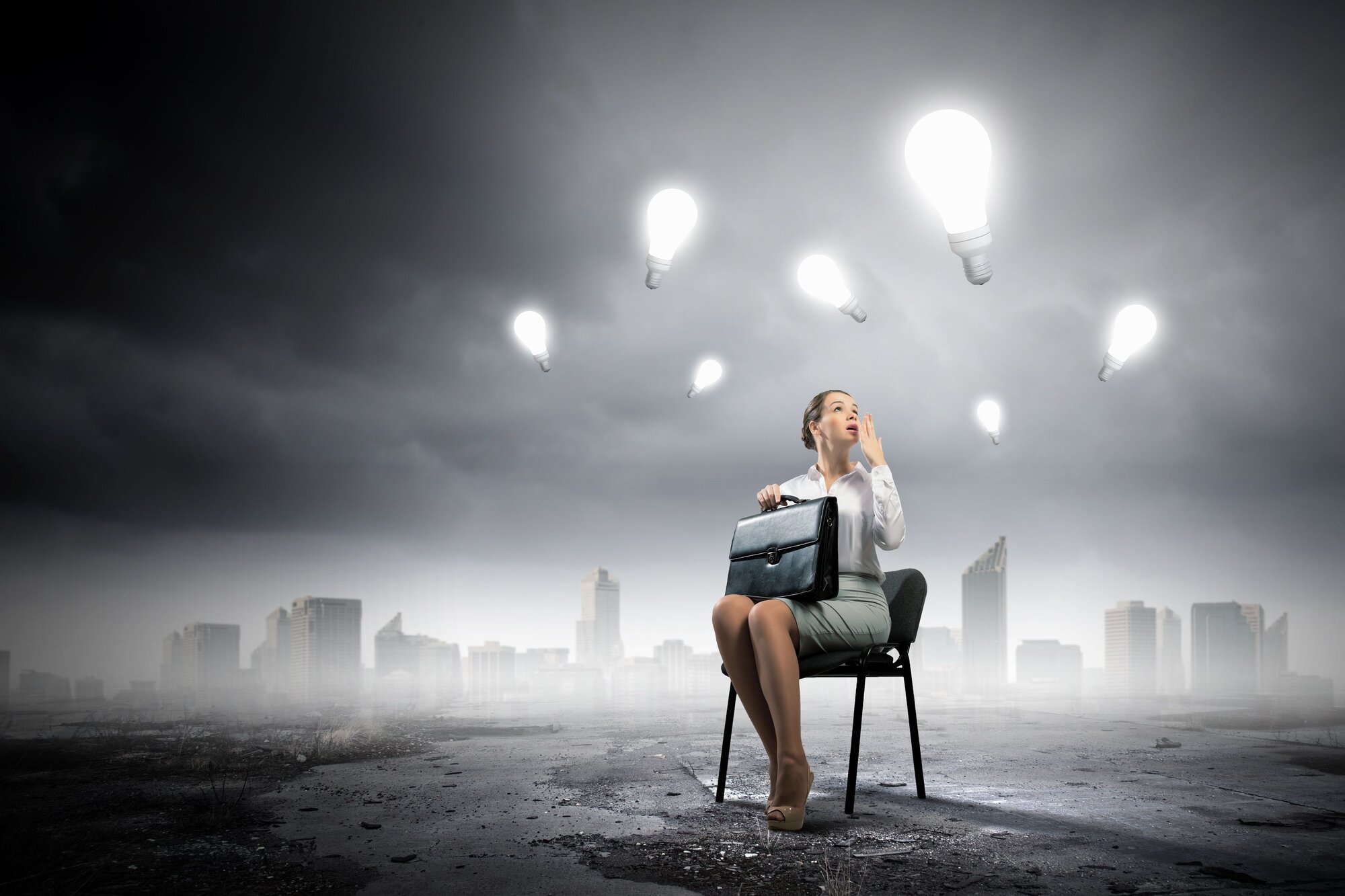 Illustrasjonsfoto av dame som sitter på en stol mens lyspærer lyser over hodet hennes