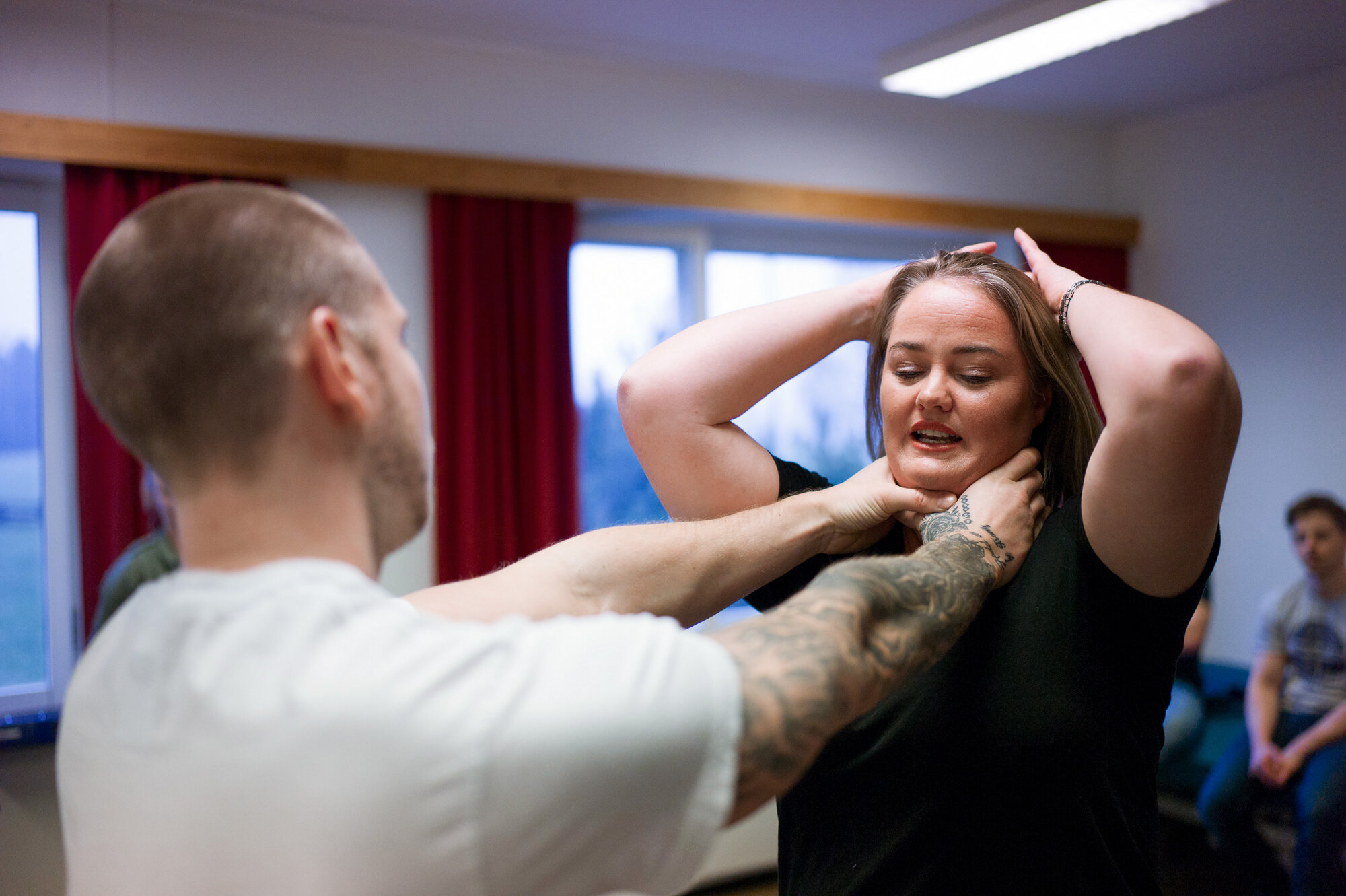 Så har tiden kommet for frigjøring fra kvelertak. Den effektive måten man lærer på selvforsvarskurs, med å ta hendene opp og slå vekk pasientens armer, er ikke noe de lærer her. Østengen viser den samme hodebeskyttelsen som de terpet på først. I kombinasjon med rotasjon nedover, slår hun vekk pasientens armer med underarmene sine.