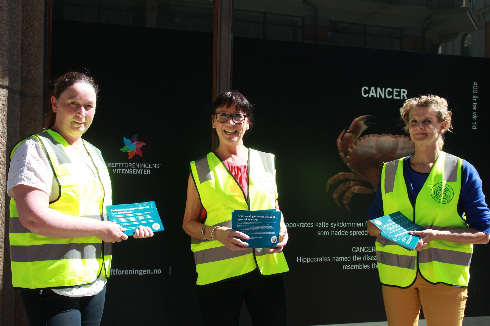 Utenfor Kreftforeningens hovedkontor i Oslo står sykepleierne Janne Koksvik, Sigrid Elisabeth Trandu og Anneli Bjerregaard Madsen streikevakt.