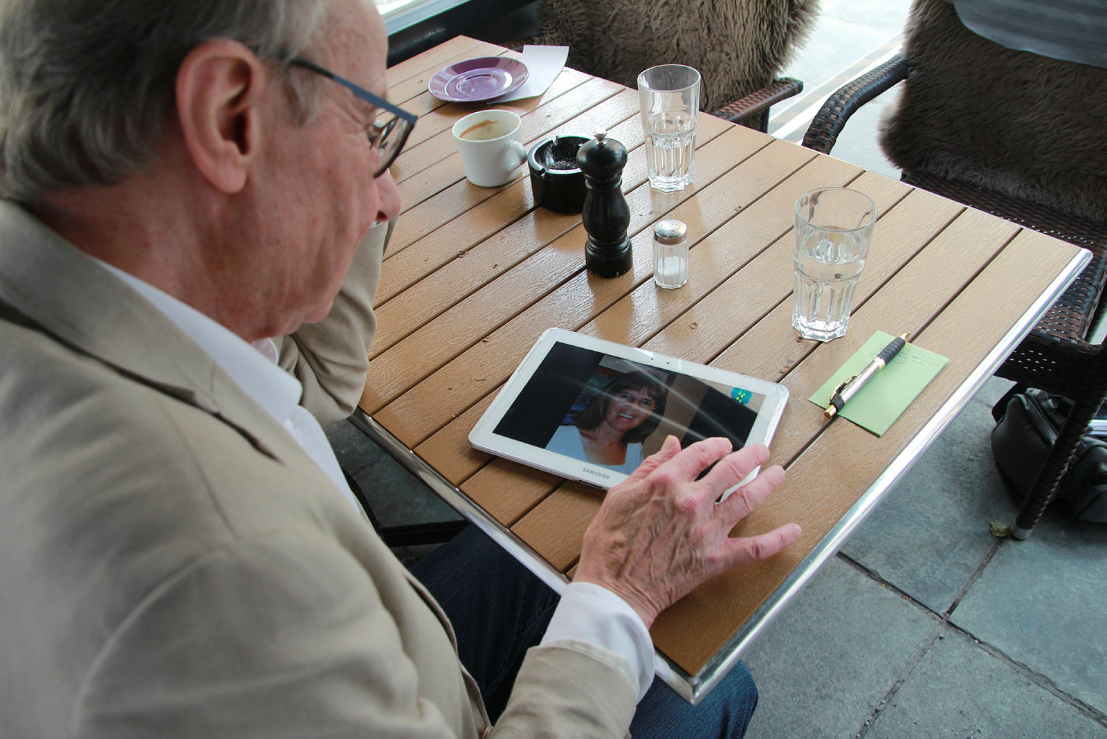 Erling Bonde ser på bilder av sin kone, Ingrid Bonde.