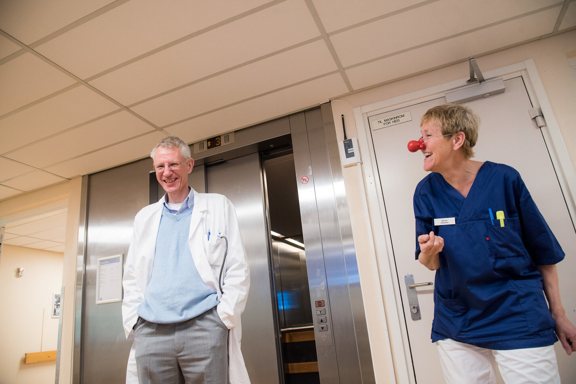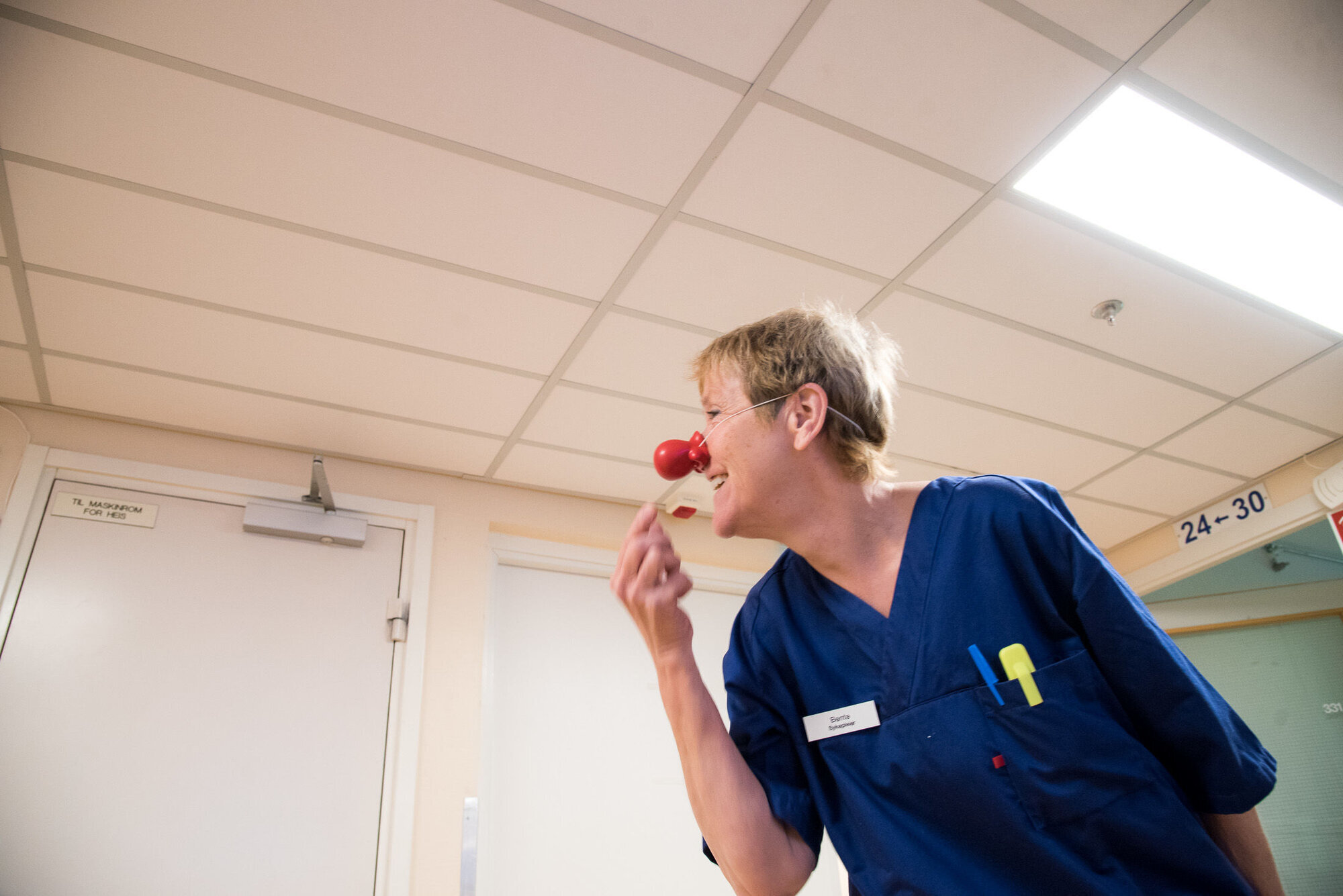 «Honk-honk» lyder den røde nesen når sykepleier Bente Gulbrandsen klemmer på den.