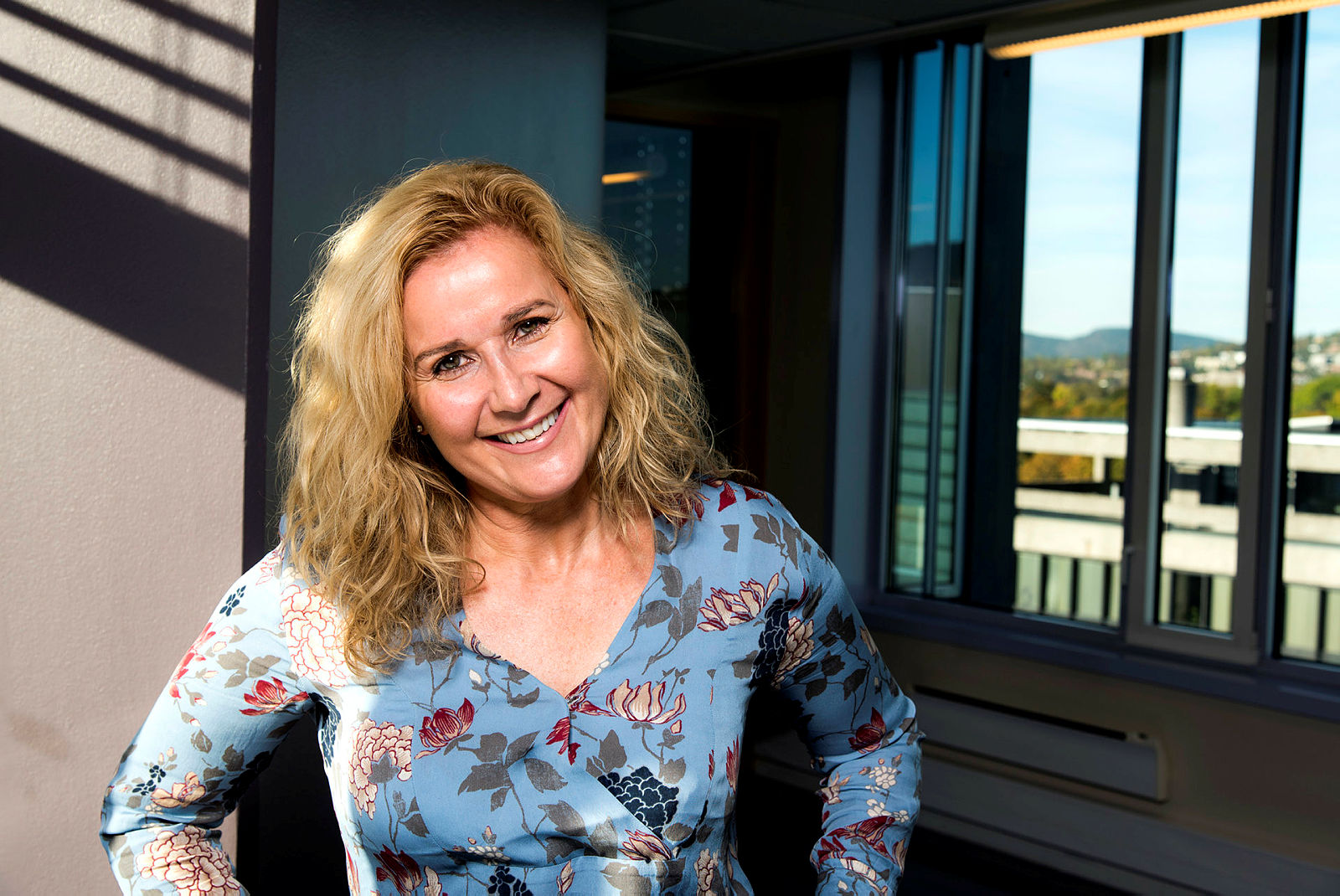 Hun sitter i en lilla svingstol på kontoret sitt i 8. etasje hvor hun kan se ned på NHO og Frognerparken.