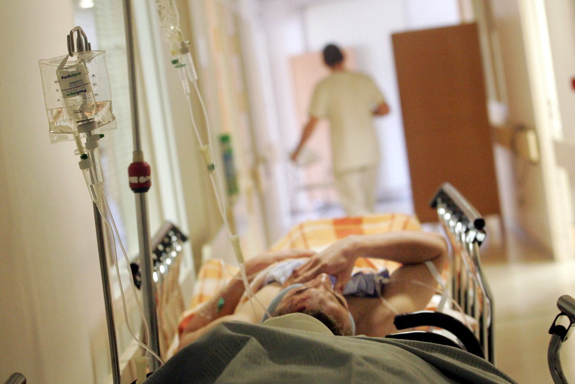 Korridorbilde fra sykehus hvor det ligger en pasient. Helsepersonell går bortover