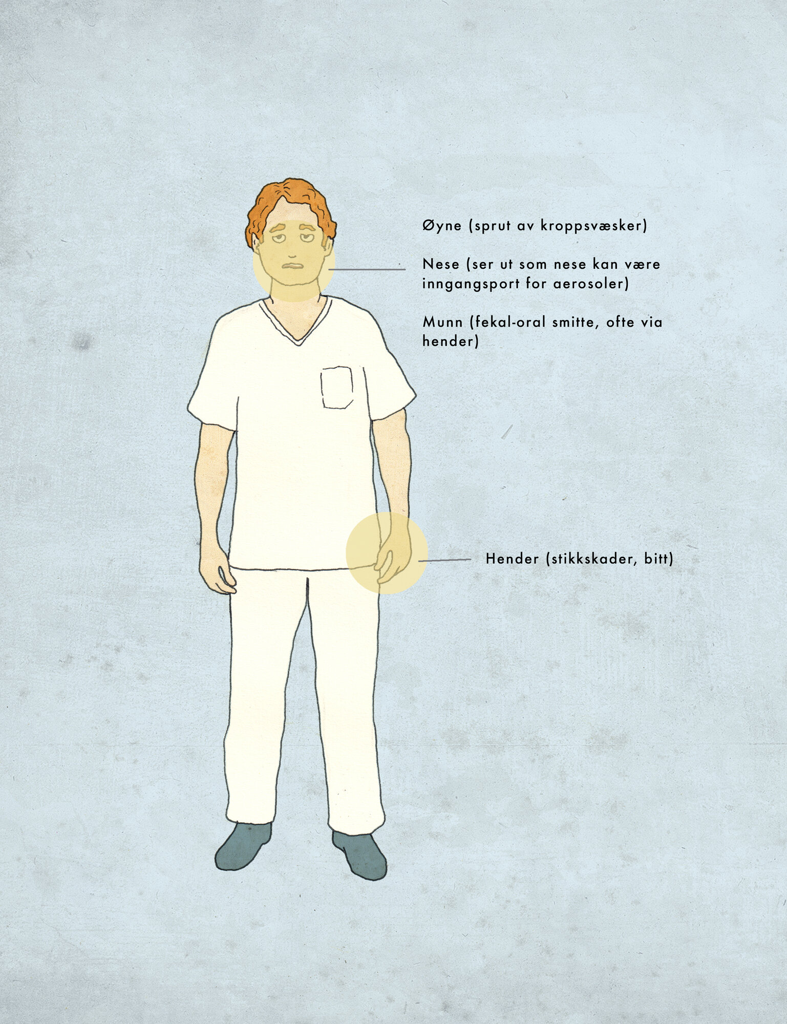 Når: Vurder beskyttelse av munn og nese ved ­prosedyrer hvor det kan sprute kropps­væsker eller annet flytende ­materiale som kan inneholde smittestoffer.