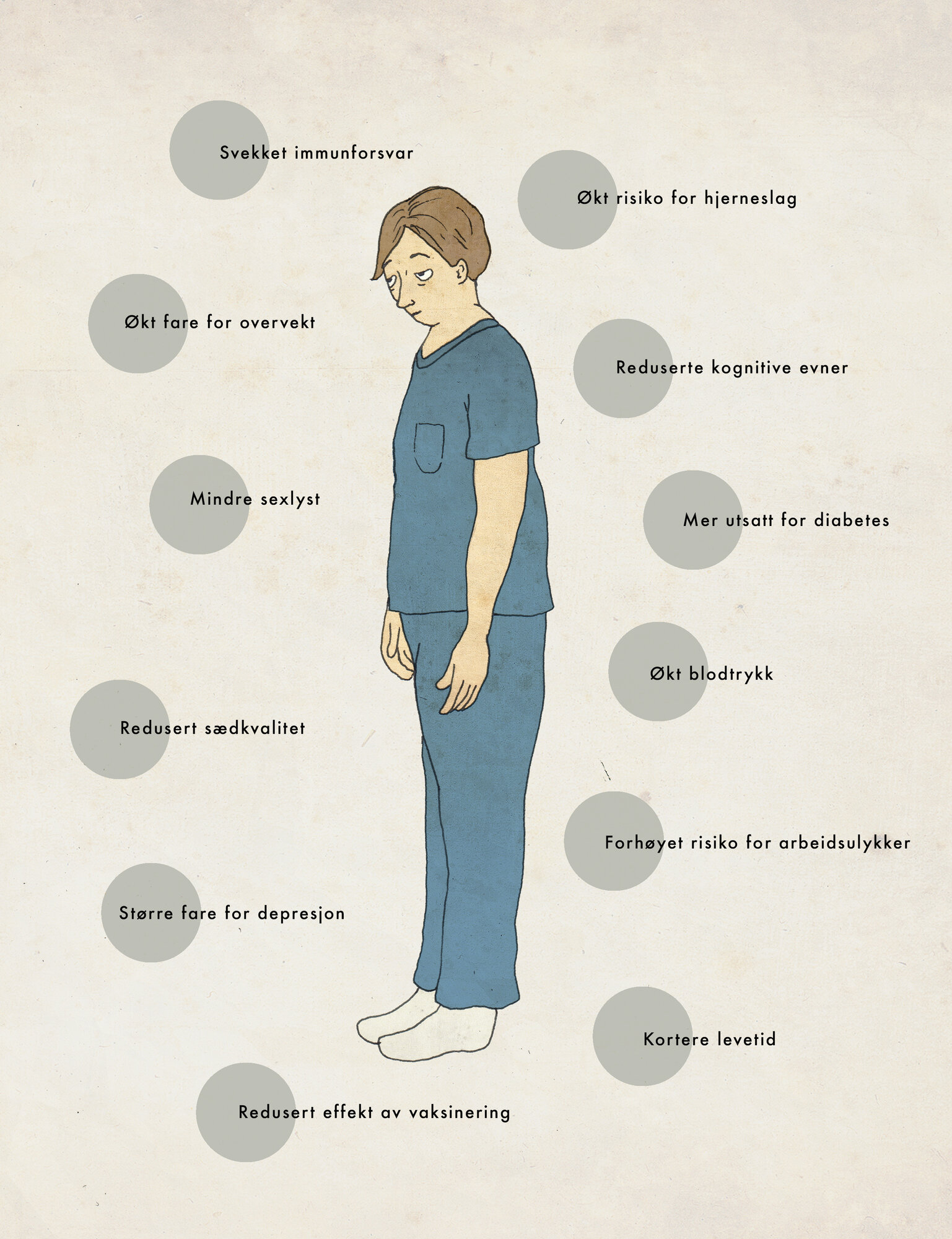 Vi er biologisk programmert til å være våkne på dagen og sove om natta. Natt- og aftenvakter er mest uheldig, men også tidlige dagvakter kan gi «skiftarbeiderlidelse». Eksponering av ulik type farget lys kan gjøre det lettere å tilpasse døgnrytmen. Sein-tidligvakter kan være verre for søvn og helse enn nattskift og øker risikoen for sykemeldinger. Powernap på nattevakter øker prestasjonsnivået og gir bedre søvn etter nattevaktene. Snakk med lederen din!
