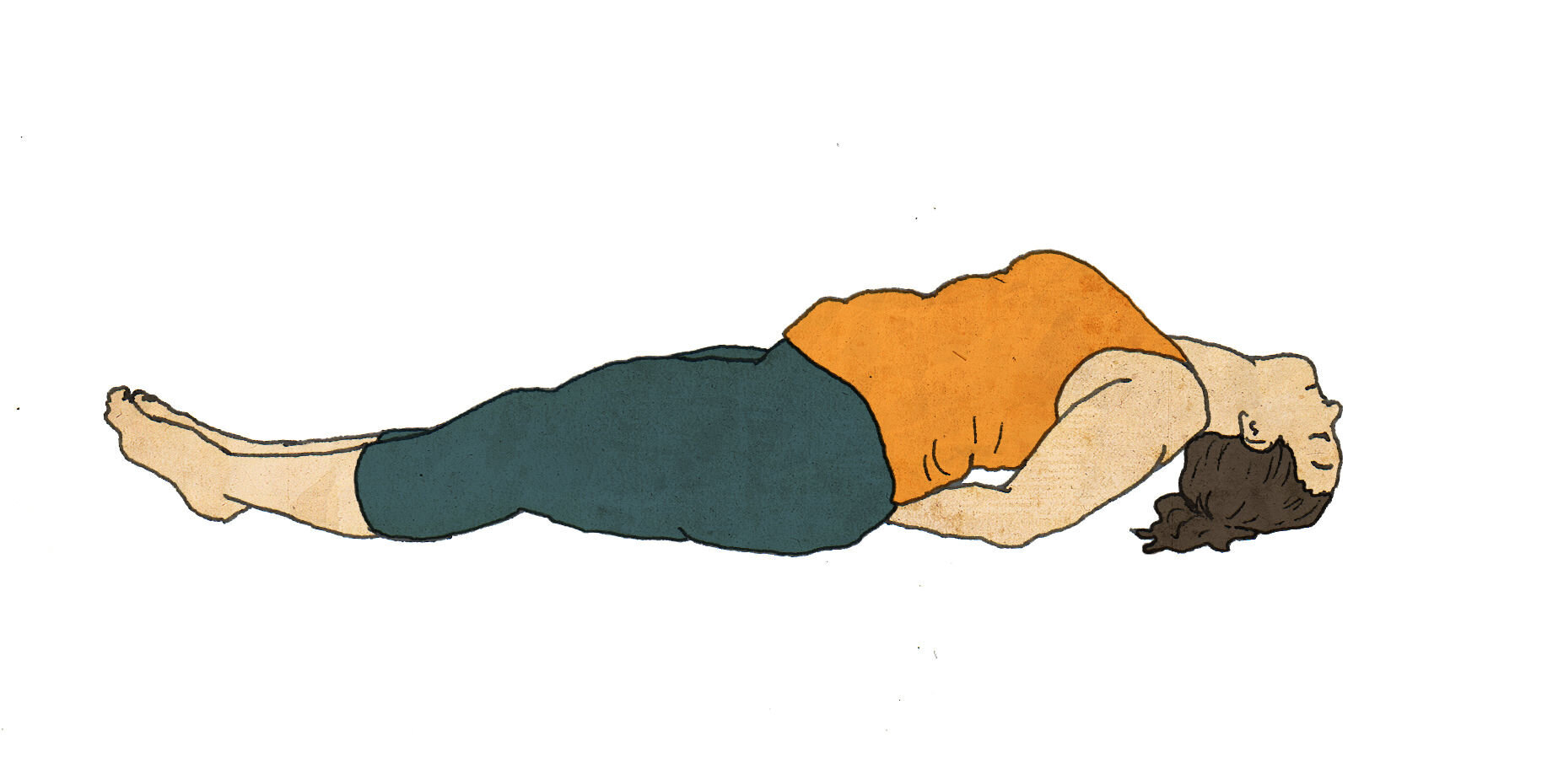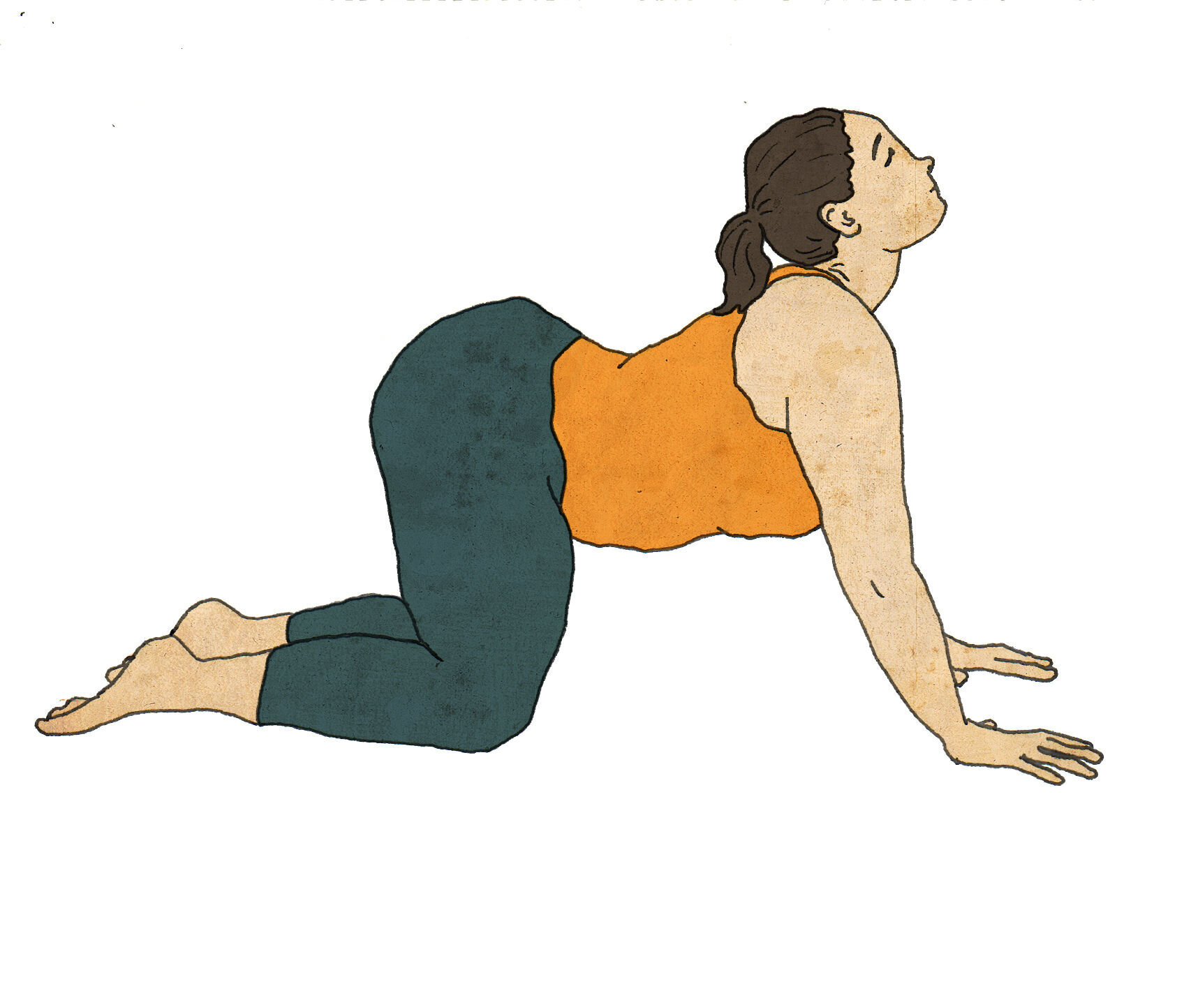 Løft deg så opp på albuene, slik at overkroppen kommer opp. Skyt brystet opp mot taket, og trekk skuldrene bakover. Slipp hodet og nakken forsiktig bakover, slik at toppen på hodet søker mot gulvet. Bli i fem pust.