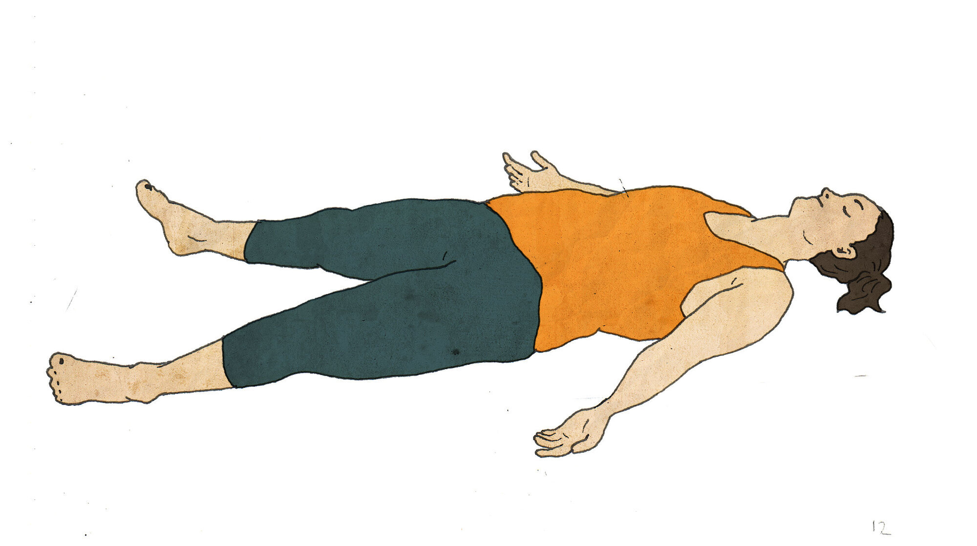 Strekk så ut bena i Savasana. Armene ligger litt ut fra kroppen med håndflatene vendt opp mot taket. Ha god avstand mellom føttene.