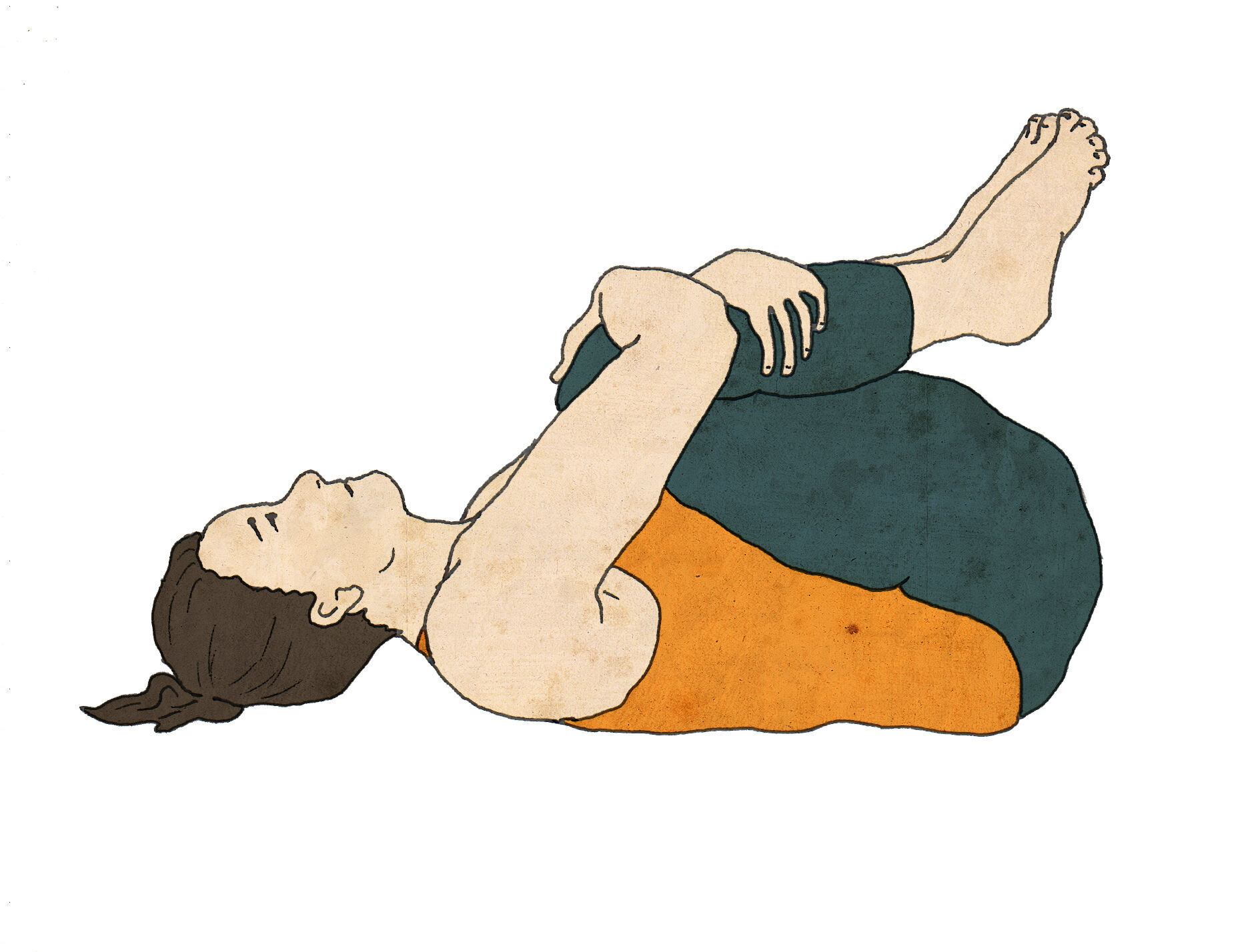 12. Legg deg ned på ryggen, trekk knærne mot brystet og hold rundt knærne.