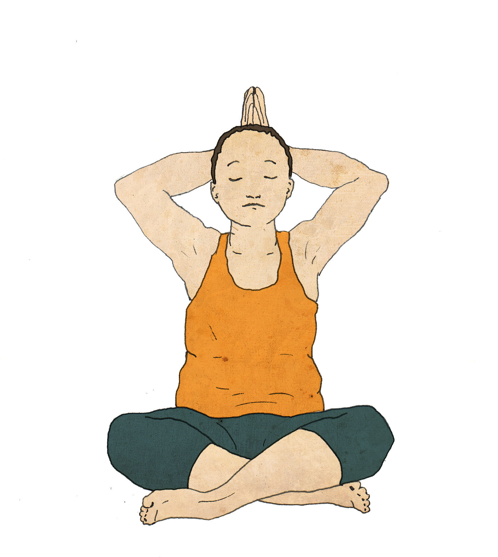 Løft hodet, nakke og ryggsøyle. På innpust, press også her hendene sammen så lenge du klarer å la innpustet vare.