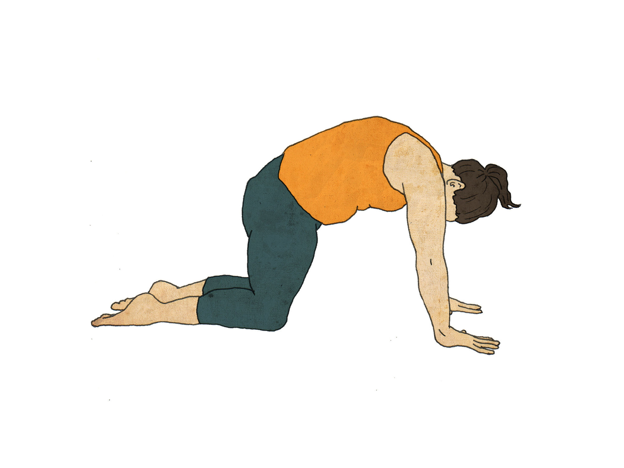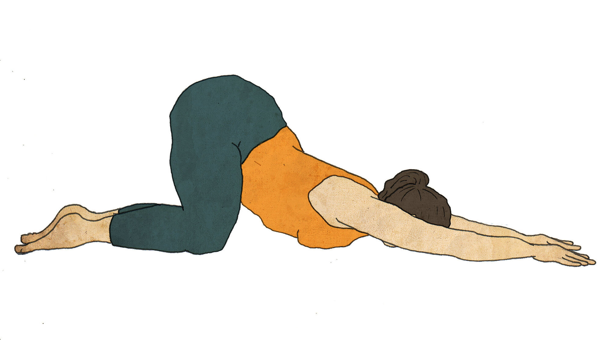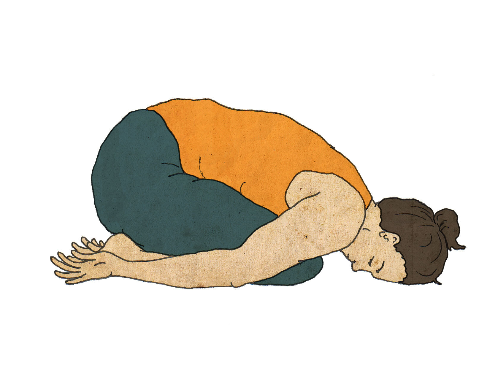 Beveg armene tilbake til utgangsposisjon, og senk setet ned mot hælene. Legg pannen ned mot gulvet og armene langs siden av kroppen i Balasana/barnet. Stillingen minner om fosterstilling i mors liv og roer nervesystemet. Også her slipper spenninger i nakken, om du tillater det.