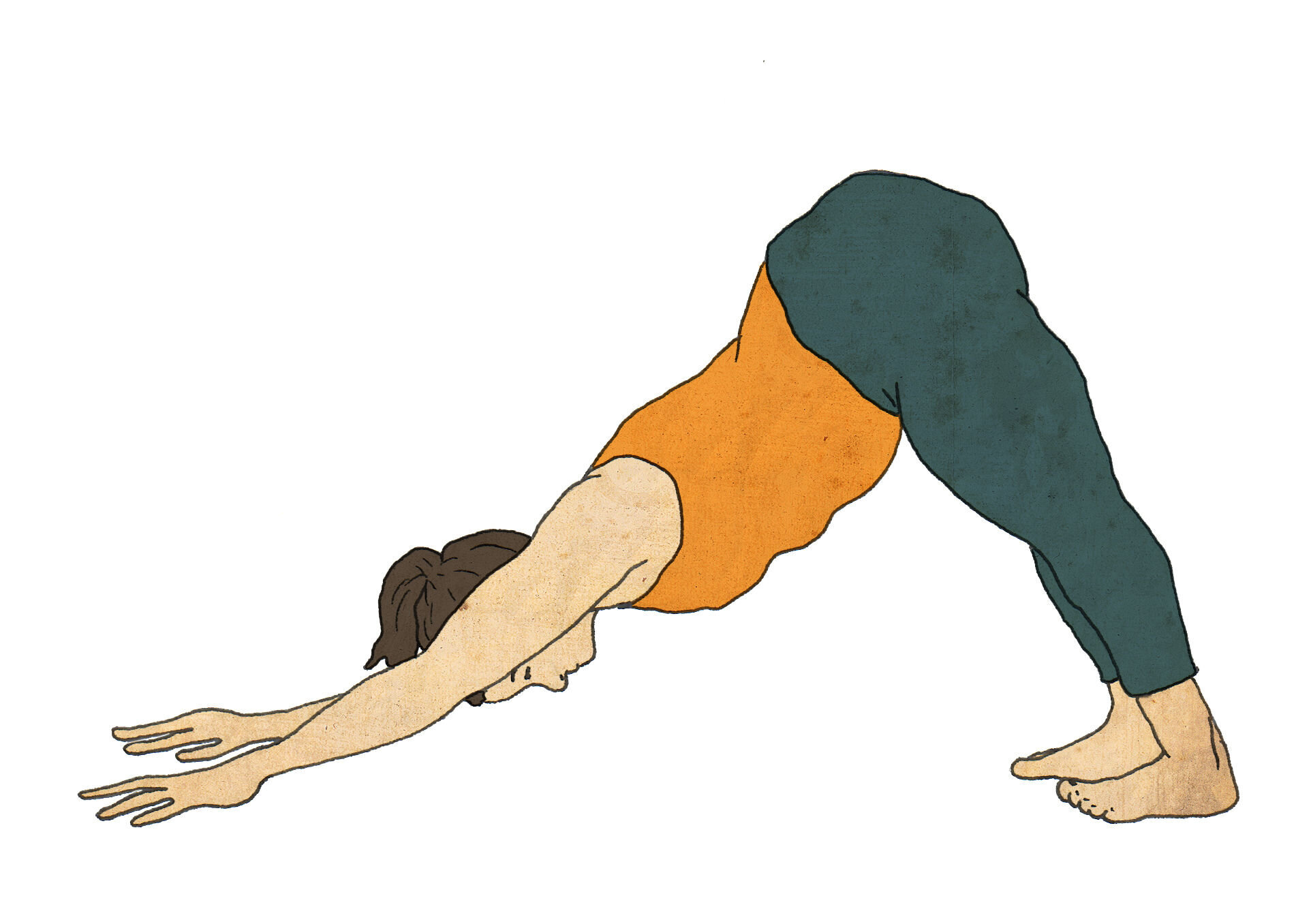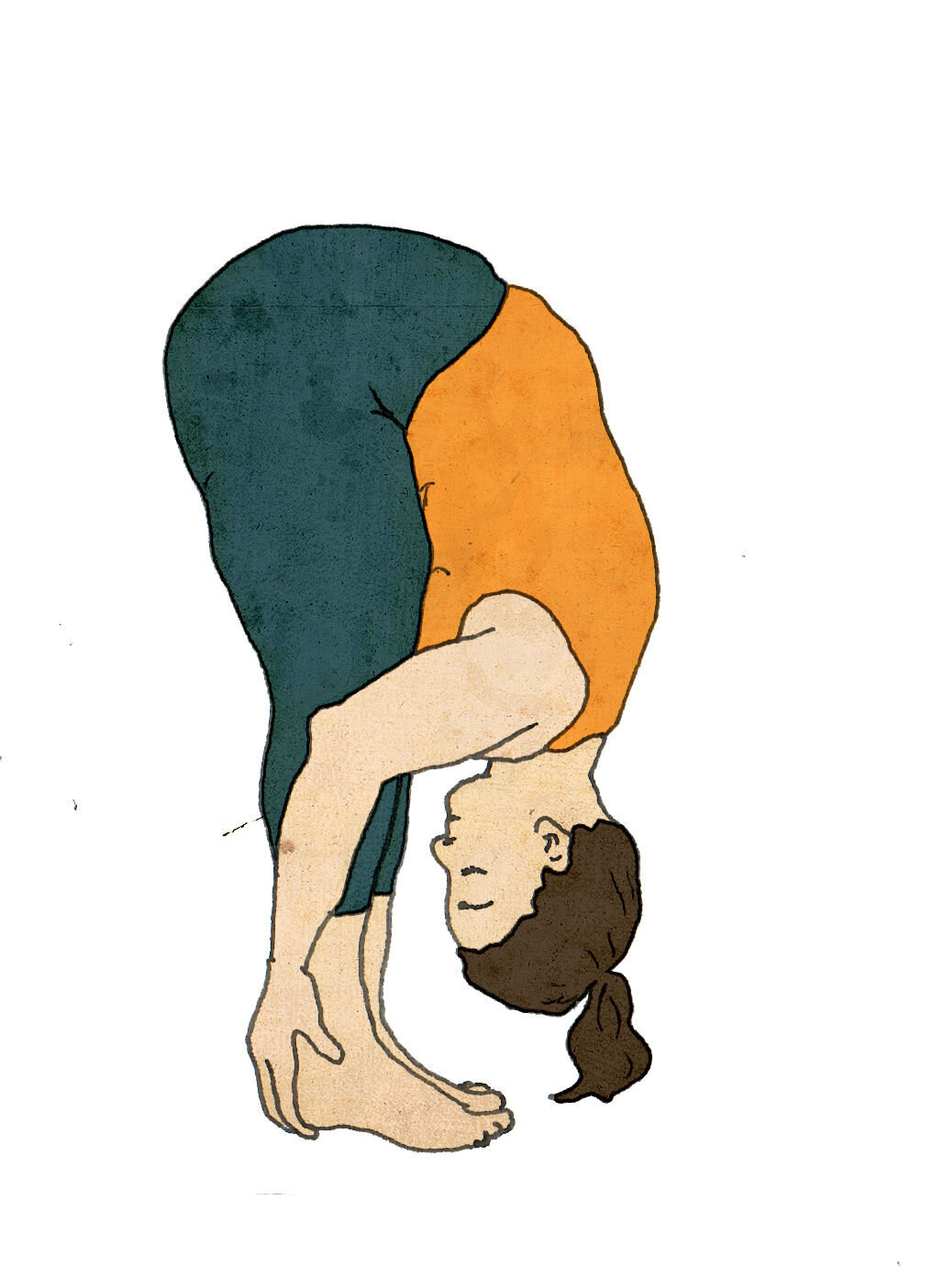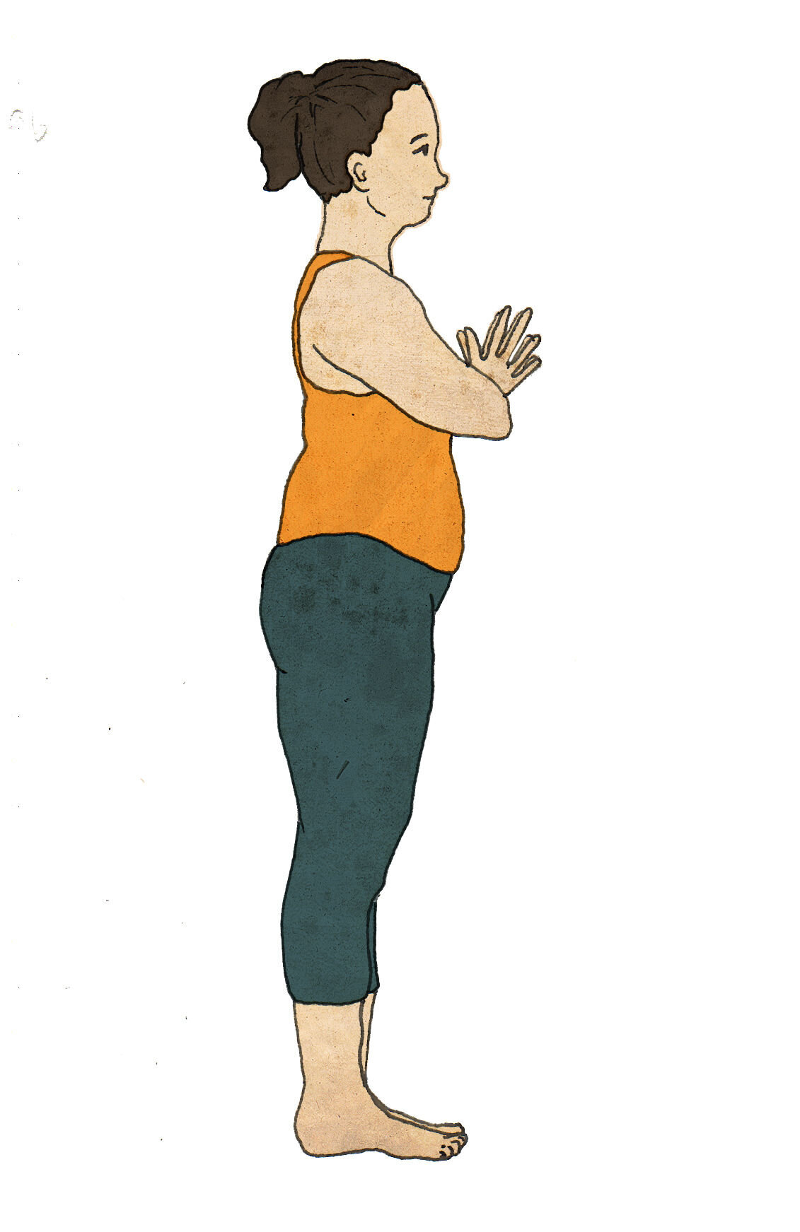 På utpust, senk hendene samlet foran brystet. Stå her og finn stillhet innover så lenge du ønsker, før du snur hendene (fortsatt samlet) som en pil nedover mot gulvet, samtidig som du beveger overkroppen ned mot gulvet. Strake ben.