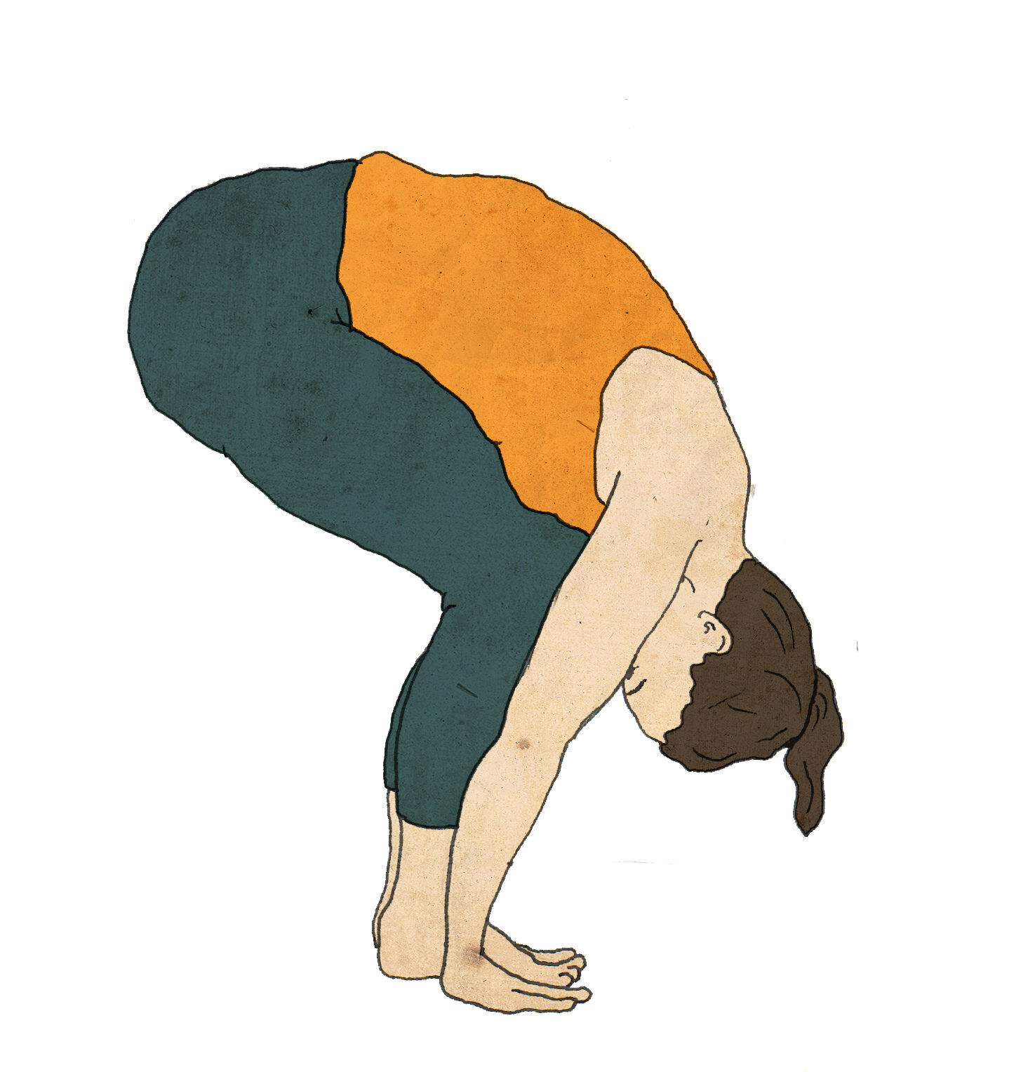 Pust ut, krum ryggen og la hodet falle ned mot gulvet. Kjenn at nakken hviler fullstendig. Integrer pusten og lukk gjerne øynene.