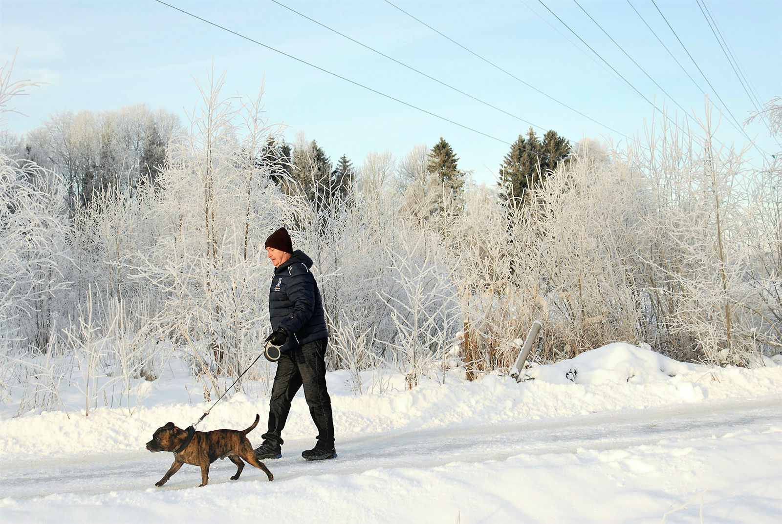 Den kraftige tassen på fire bein spinner rundt husfar og seg selv, haler i båndet og dekorerer brøytekanter med stor iver.