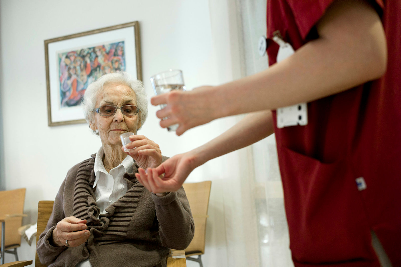 Bildet viser en eldre kvinne som får utdelt medisiner