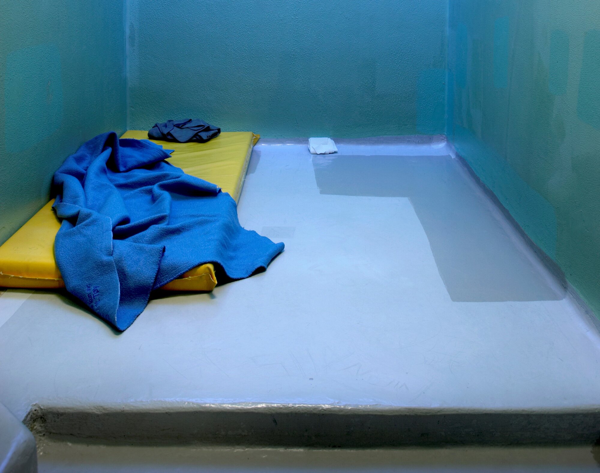 Polstret celle med madrass på gulvet. Isolasjon i fengsel.