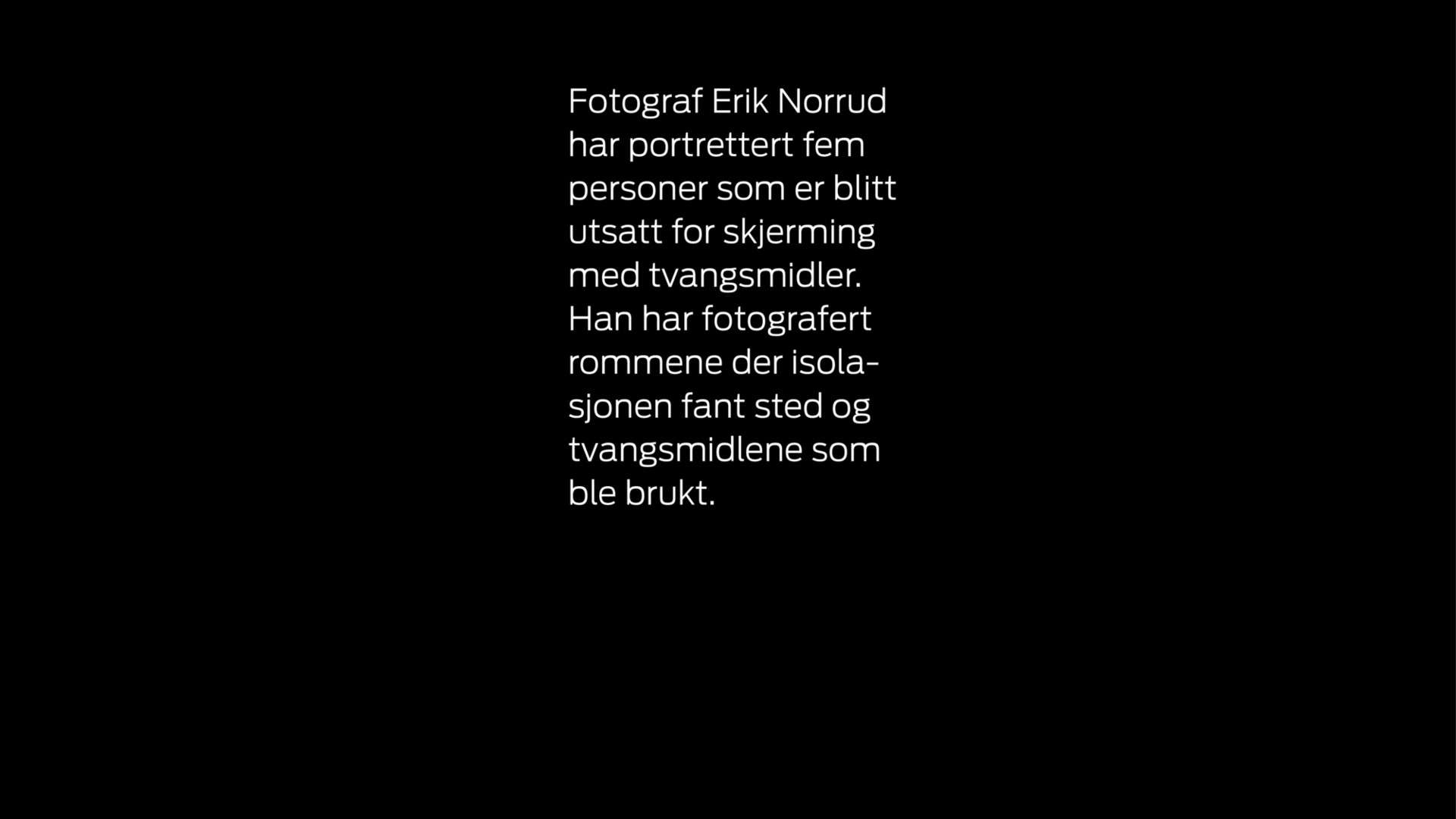 Fotograf Erik Norrud har portrettert personer som er blitt utsatt for skjerming med tvangsmidler. Han har fotografert rommene der isolasjonen fant sted og tvangsmidlene som ble brukt.