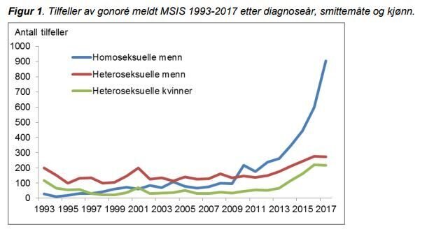 Instituttets oversikt viser at antallet registrerte tilfeller i fjor var 1399, en økning på 28 prosent sammenlignet med 2016. Økningen var størst blant menn som har sex med menn, der antall tilfeller av gonoré i fjor økt med 50 prosent sammenlignet med året før.