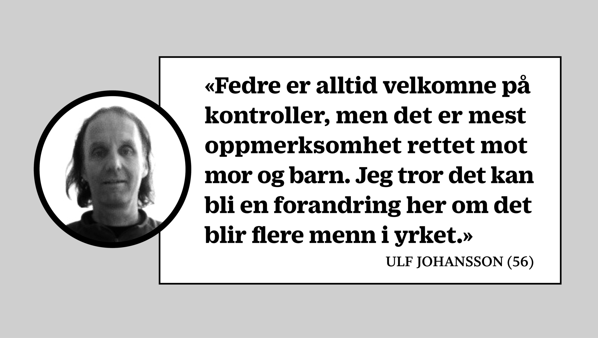 – Fedre er alltid velkomne på kontroller, men det er mest oppmerksomhet rettet mot mor og barn. Jeg tror det kan bli en forandring her om det blir flere menn i yrket. I skolehelsetjenesten deler man dessuten gjerne inn i jente- og guttegrupper når de snakker om seksuell helse, og da kunne det nok vært en fordel om en mann snakket til gutta.