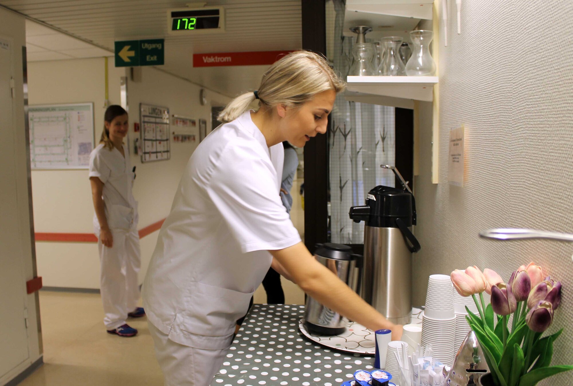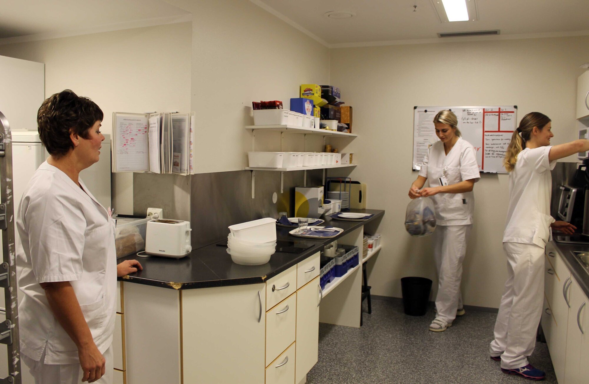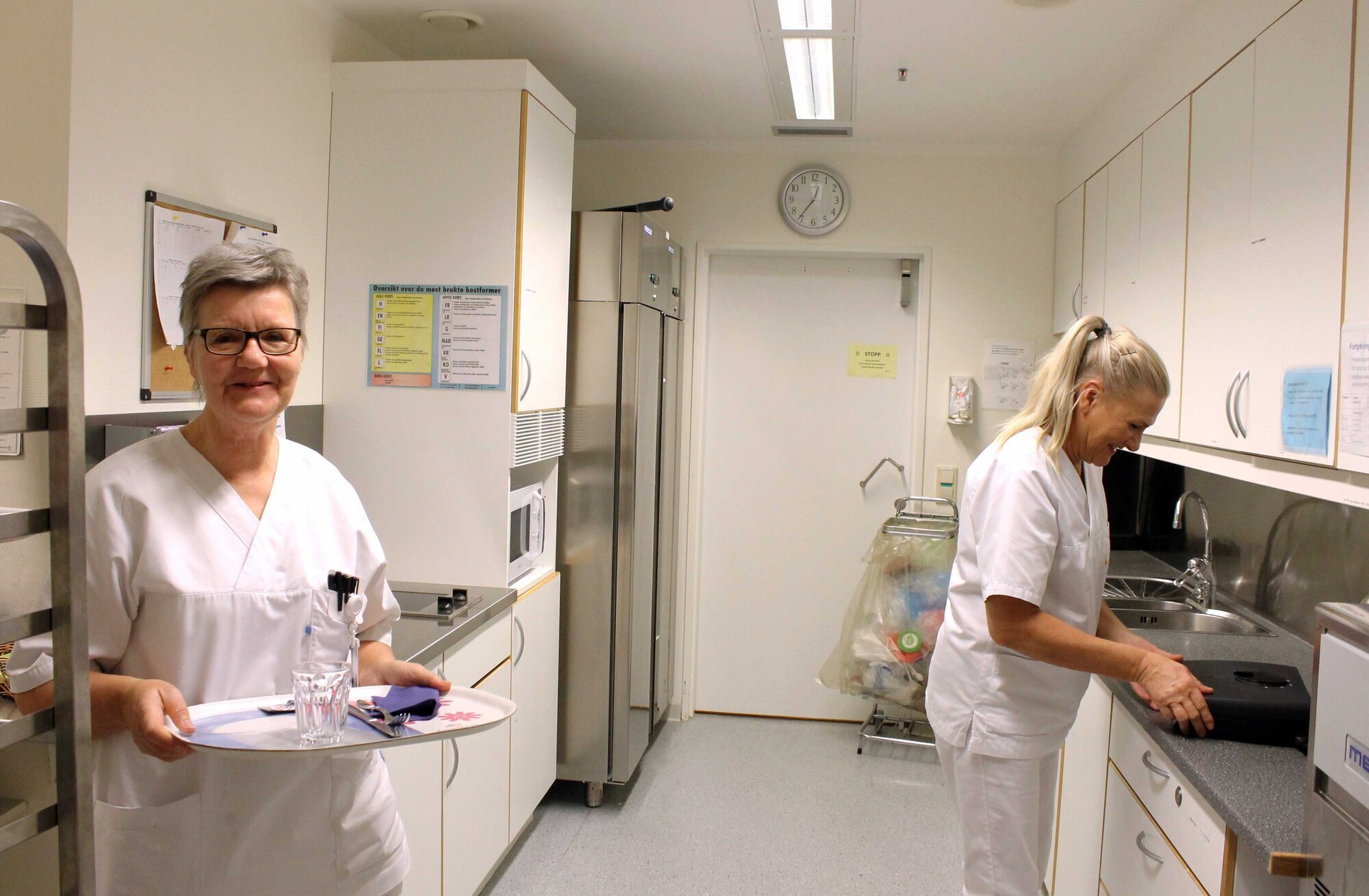 På Medisinsk sengepost 2A jobber kjøkkenassistent Jorunn Sjøkvist (53). Hjelpepleier Torbjørg Bruskeland (62), forteller at de får mer tid ute i avdelingen når Sjøkvist er på jobb.