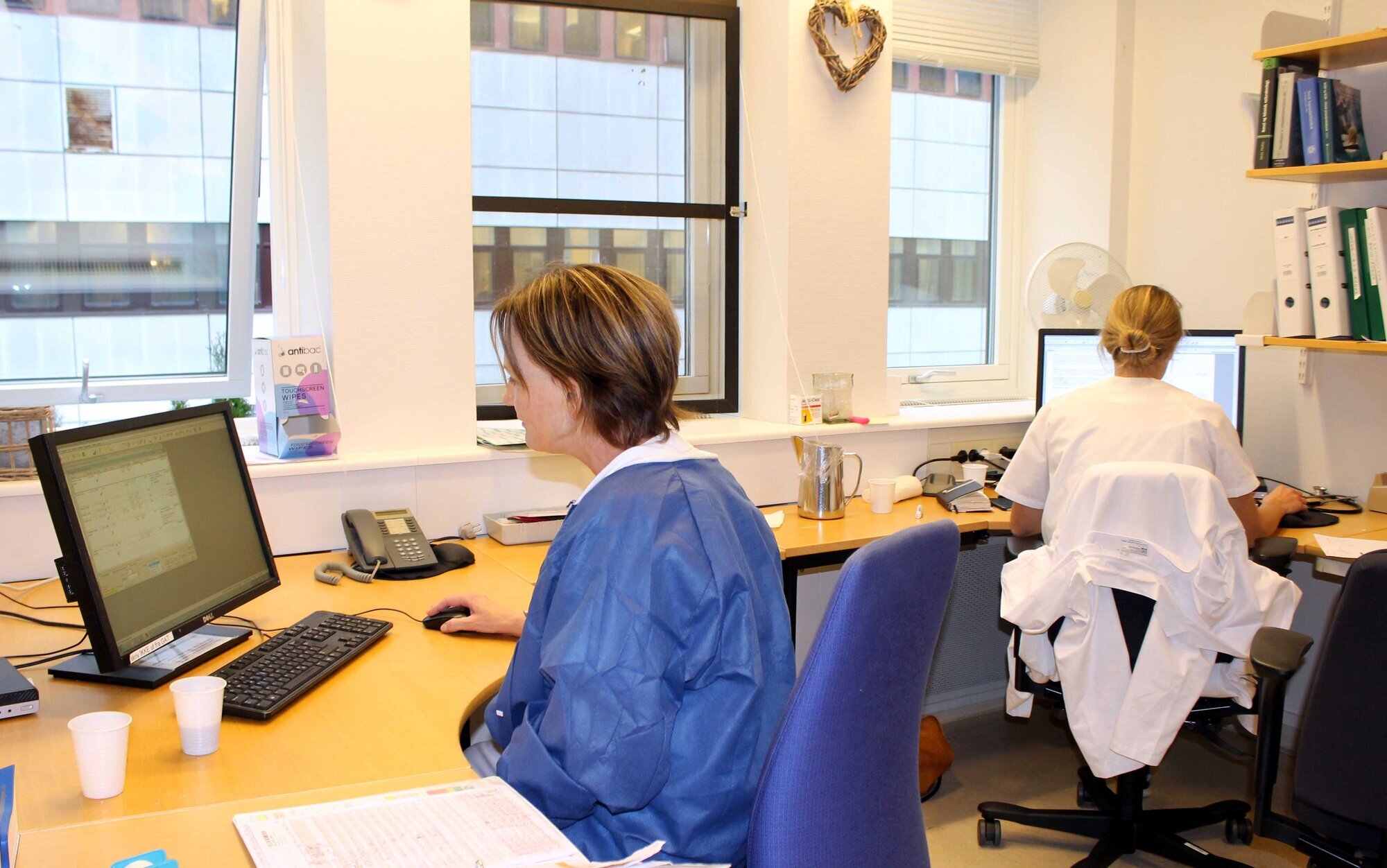 – Til syvende og sist er sykepleie definert, og vi har for eksempel transfusjoner og medisiner. Jeg har visitt denne uka, og da skal jeg ha oversikten over pasientene. Ofte har vi kontakt med pårørende. Å sitte foran PC-en og koordinere tar mye tid, sier Nomedal.