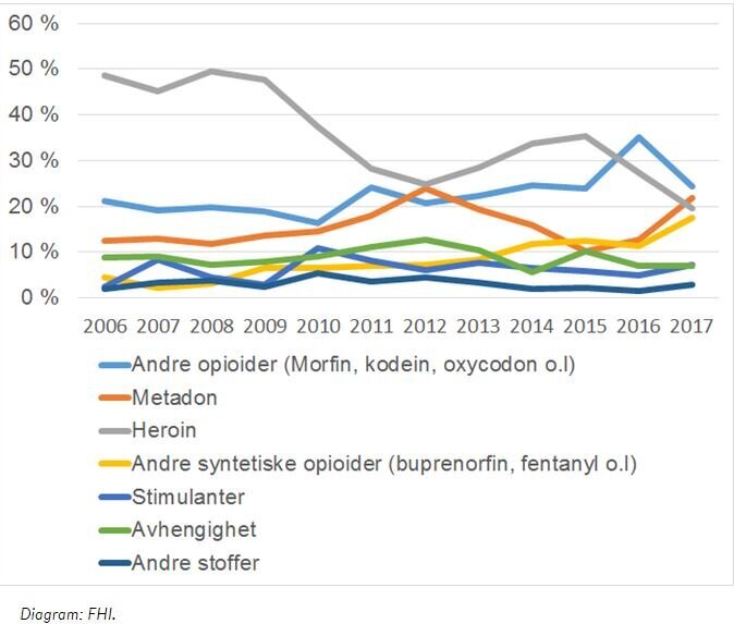 Tallene fra Dødsårsaksregisteret, som ble offentliggjort av Folkehelseinstituttet 12. desember, viser at metadon i 2017 har passert heroin som hyppigste narkotikautløste dødsårsak. Fra cirka 10 prosent av dødsfallene i 2015 har andelen økt til 22 prosent i 2017.