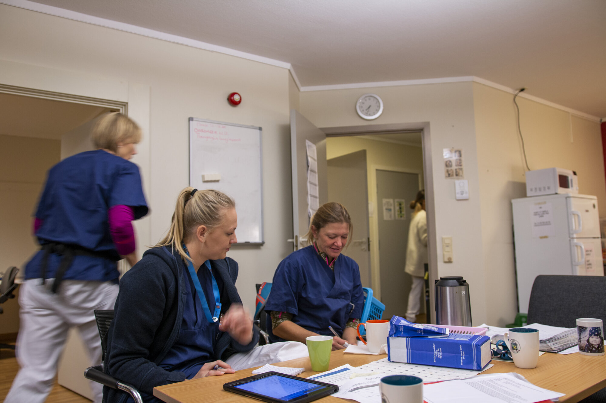 En sykepleier kommer inn med en stor skrivebok under armen, rapport glir over i arbeidsfordeling.