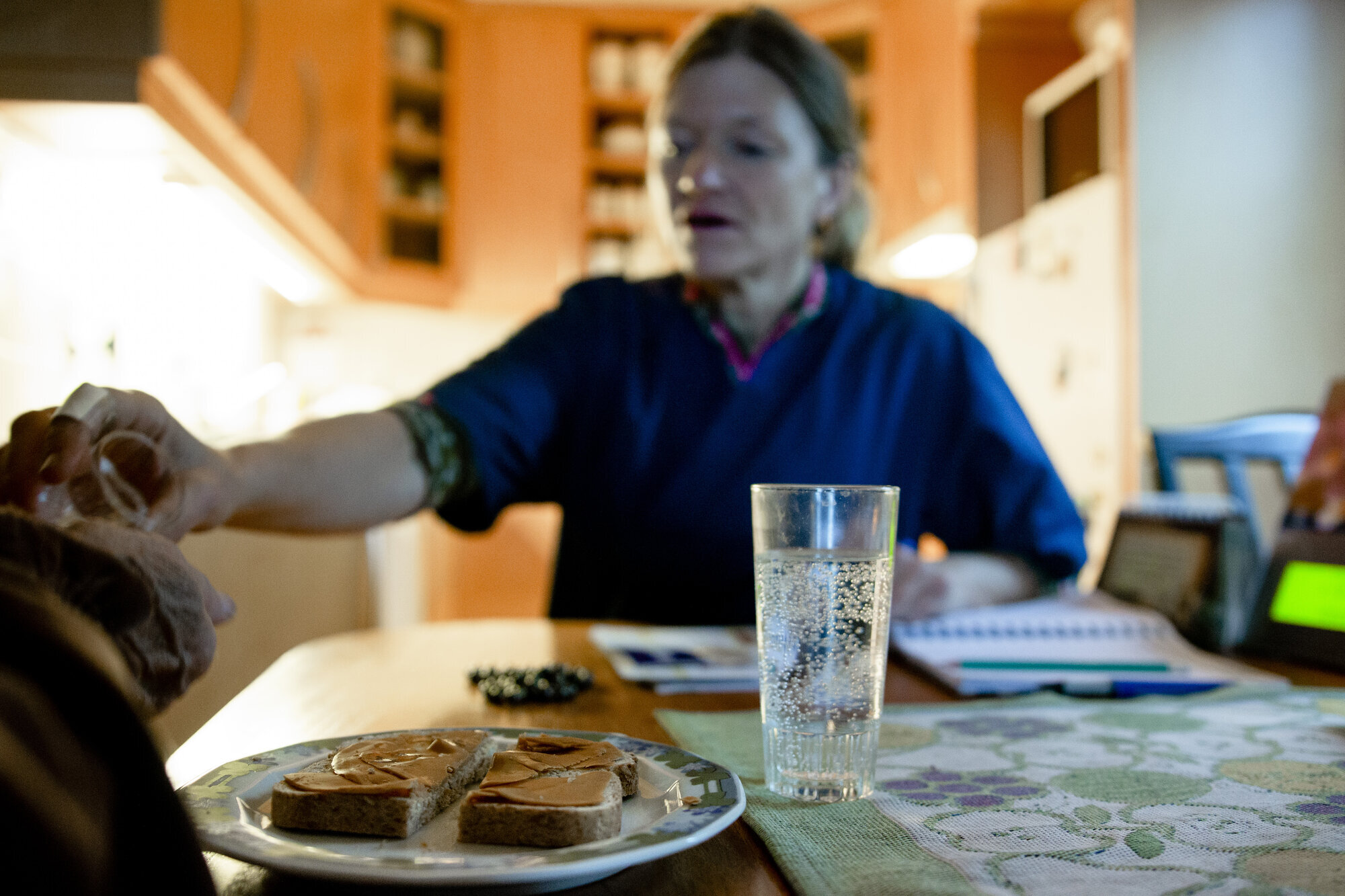 Olsen kikker inn i kjøleskapet mens hun småprater, smører en brødskive med brunost, setter et glass Farris ved siden av og rekker damen tablettene.