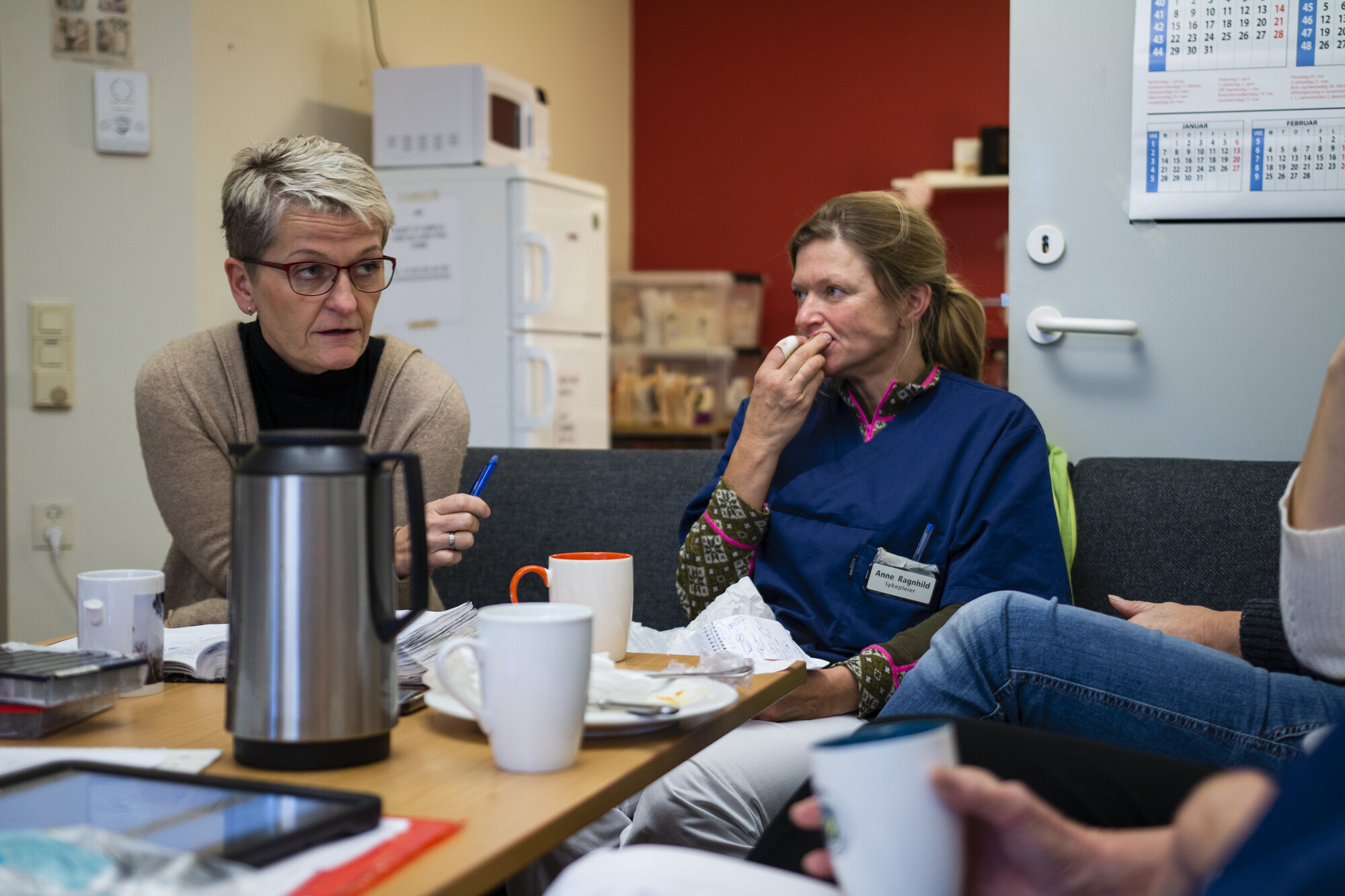 Anne Ragnhild Kråkeland Olsen skulle etter den alle første dagsplanen vært i gang med en times psykososial samtale med en pasient nå. Det blir det ikke tid til i dag. Det har hun skjønt for flere timer og innkomne mobilsamtaler siden, så pasienten er allerede informert. Noen minutter over den nyavtalte tiden er hun på vei inn til det som nå har gått fra en time til en halv times samtale.