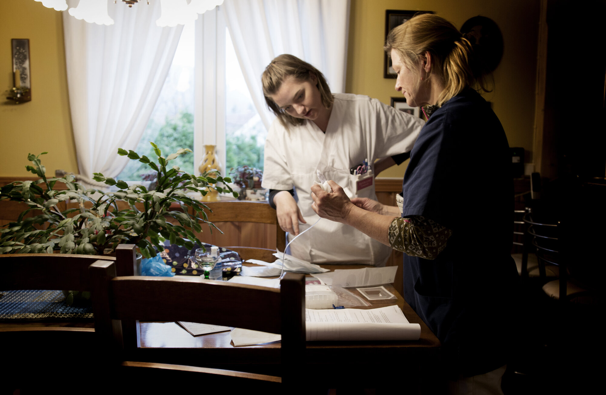 Konsentrert flytter de seg ut til stuebordet for å ha plass til å legge de forskjellige delene utover, og setter i gang med den sterile delen av prosedyren.