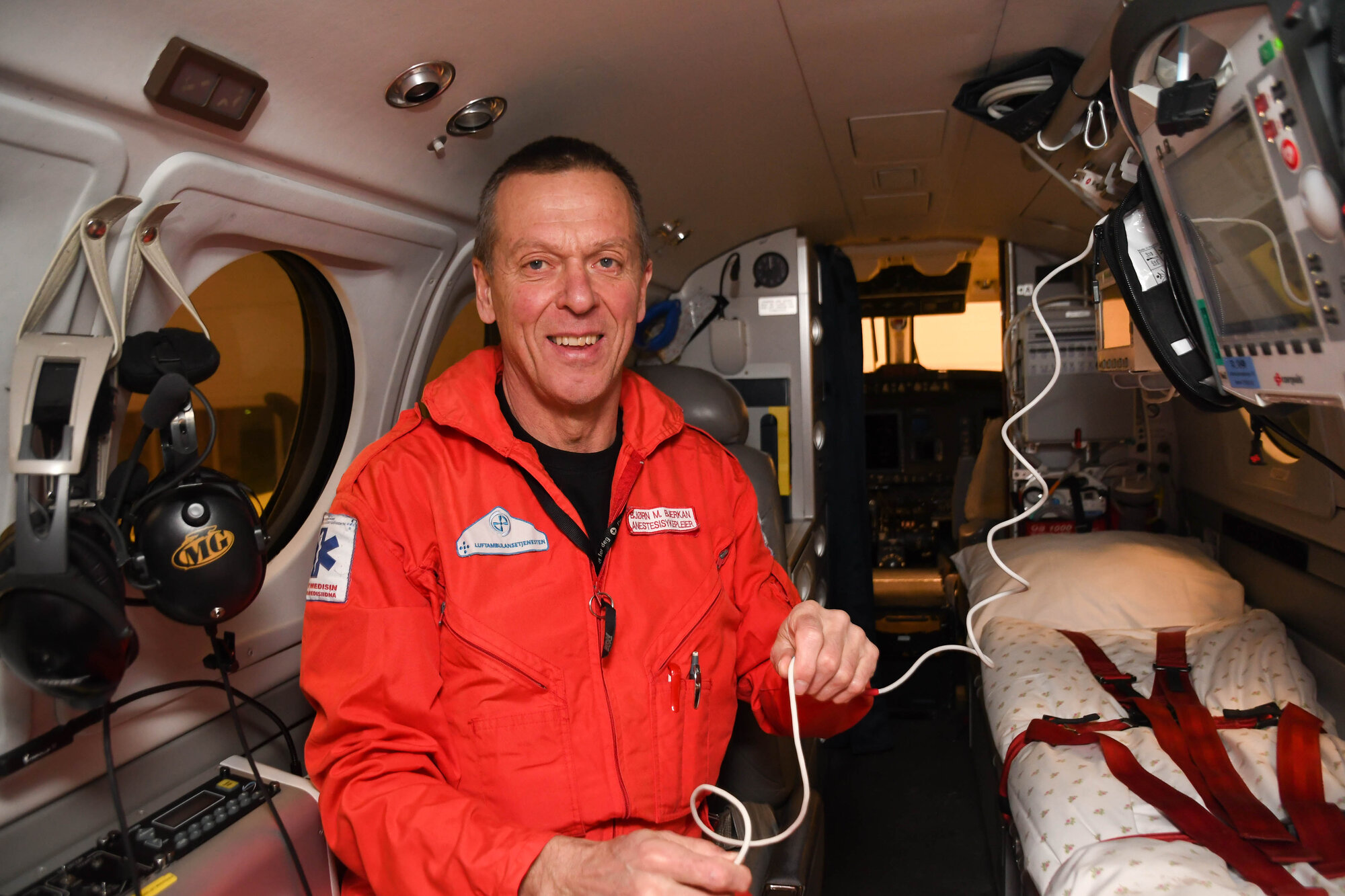 Flysykepleier Bjørn M. Bjerkan har ansvar for medisinsk behandling og sikkerhet bak i cabinen – ofte helt alene.