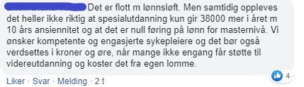 «Det er flott med lønnsløft. Men samtidig oppleves det heller ikke riktig at spesialutdanning kun gir 38 000 mer i året med 10 års ansiennitet og at det er null føring på lønn for masternivå. Vi ønsker kompetente og engasjerte sykepleiere og det bør også verdsettes i kroner og øre, når mange ikke engang får støtte til videreutdanning og koster det fra egen lomme.»