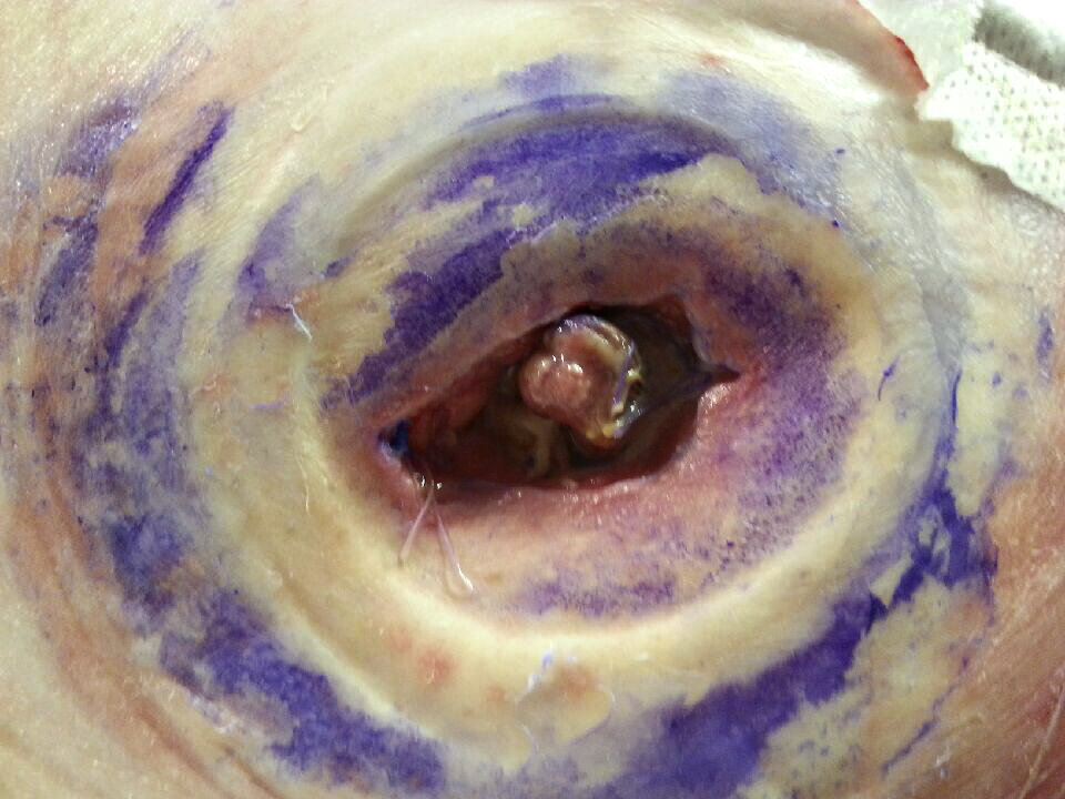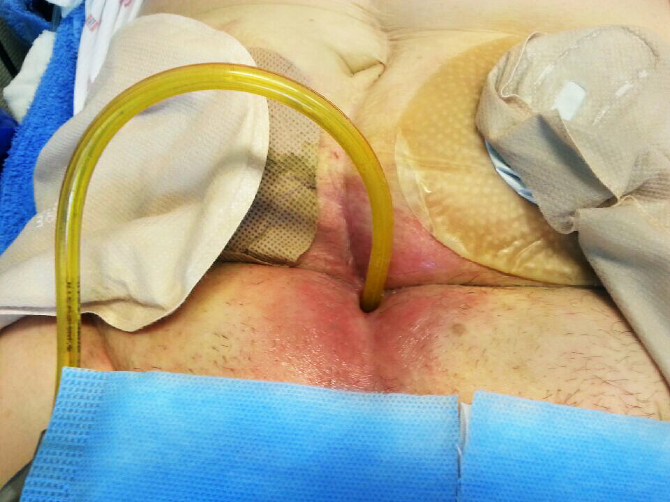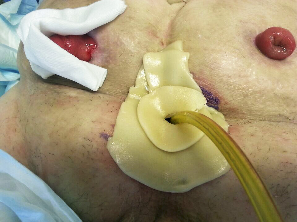 Pasienten, som har hatt strålebehandling og operasjon, har to stomier. Kroppen har dannet en fistel, i dette tilfellet en egen kanal for avføring som kommer ut i et nytt hull. Såret er vanskelig å hele fordi det ligger i en grop. Det kommer ofte og mye avføring, som er tynn og veldig etsende. Slangen brukes for å styre vekk avføringen, slik at det blir lettere å bandasjere.